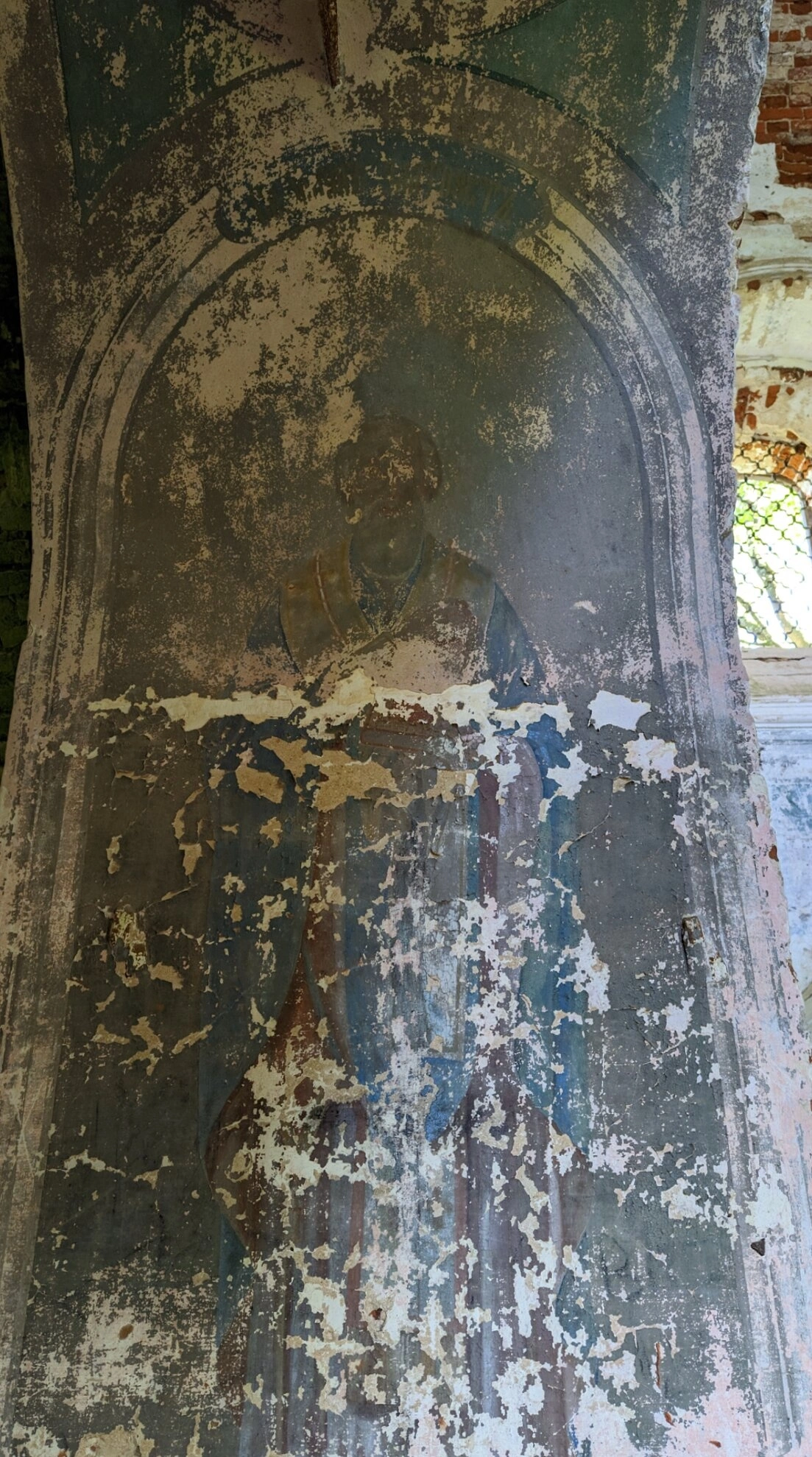 На представленной фотографии запечатлен фрагмент интерьера Воскресенской церкви, расположенной в селе Афанасьево. Центральное место на снимке занимает массивная колонна, несущая на себе остатки старинной настенной росписи. Состояние фрески вызывает глубокое сожаление — красочный слой значительно поврежден, наблюдаются многочисленные осыпания и утраты.