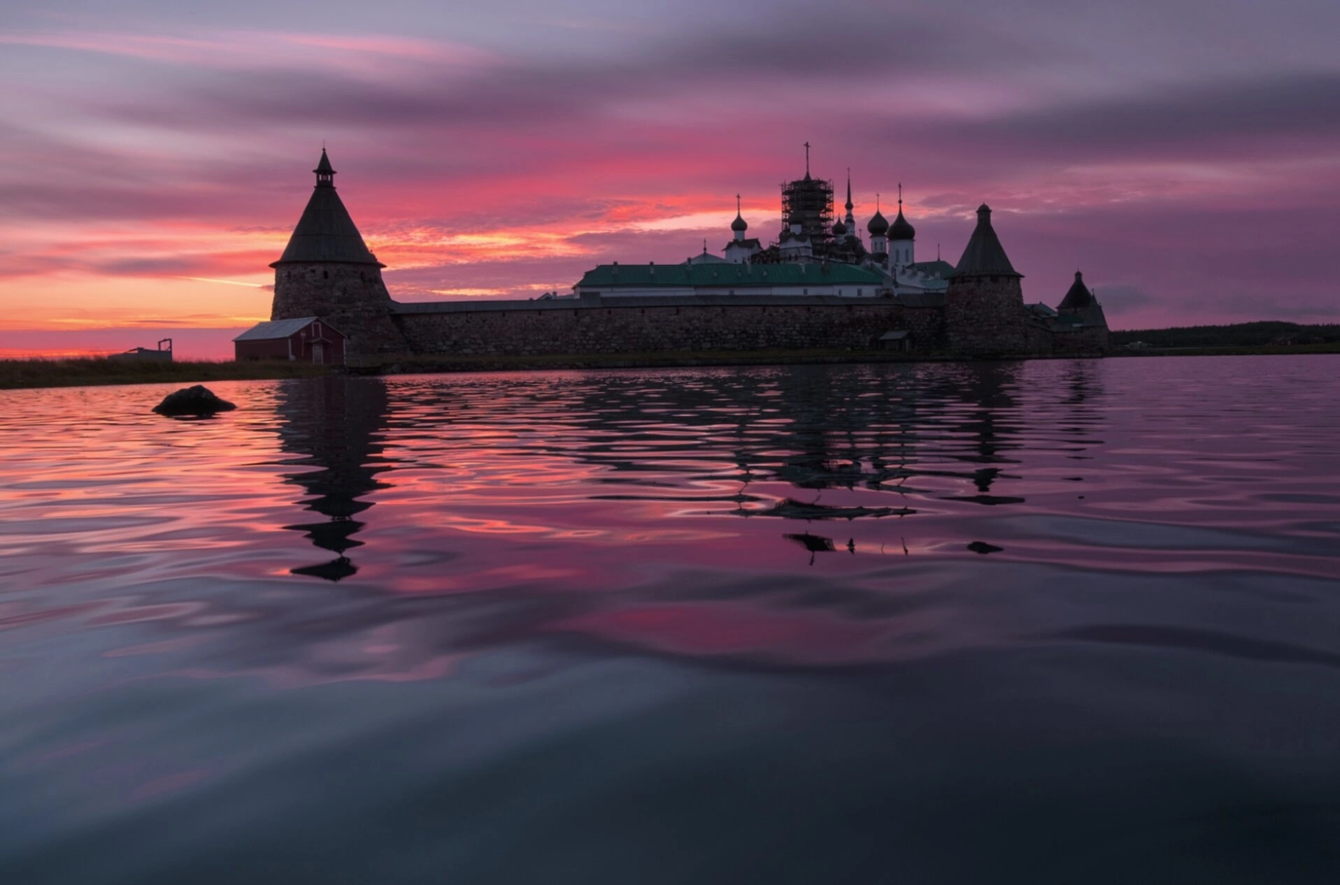 Представленная фотография запечатлела один из величайших духовных центров русского Православия — Соловецкий Зосимо-Савватиевский Спасо-Преображенский ставропигиальный мужской монастырь. Снимок сделан в тихий час на границе дня и ночи, когда последние или первые лучи солнца заливают небосвод дивными цветами: от глубокого фиолетового у вершины до пламенеющего оранжевого и розового у края земли. Слоистые облака, освещенные этим благодатным светом, напоминают о незримом покрове, простертом над святой обителью. Вся небесная красота в этот миг словно сконцентрирована вокруг монастырских стен, подчеркивая его сакральную значимость.