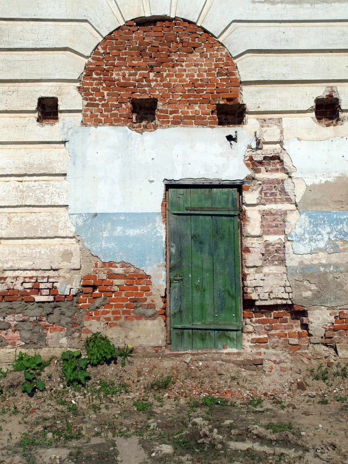 Кирпичная кладка, местами освобождённая от слоя штукатурки, открывает взору добротность и мастерство древних зодчих. В верхней части композиции угадывается арочный проём, характерный для церковной архитектуры XVII-XIX столетий. Дверь, выкрашенная некогда в зелёный цвет, ныне являет следы облупившейся краски, что придаёт образу особую духоносную подлинность и непреходящую ценность.