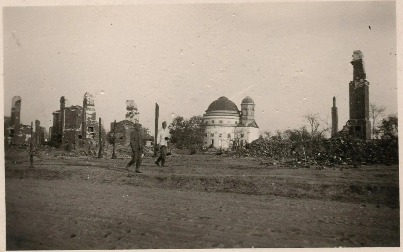 На историческом снимке, датируемым периодом с 1941 по 1944 год, запечатлён вид города Чечерска, претерпевшего значительные разрушения в ходе военных действий. В центре композиции возвышается Спасо-Преображенская церковь — единственное сооружение, устоявшее среди всеобщего разорения. Её купол и две колокольни виднеются над руинами окружавших зданий, являя собой символ несокрушимости веры и надежды.