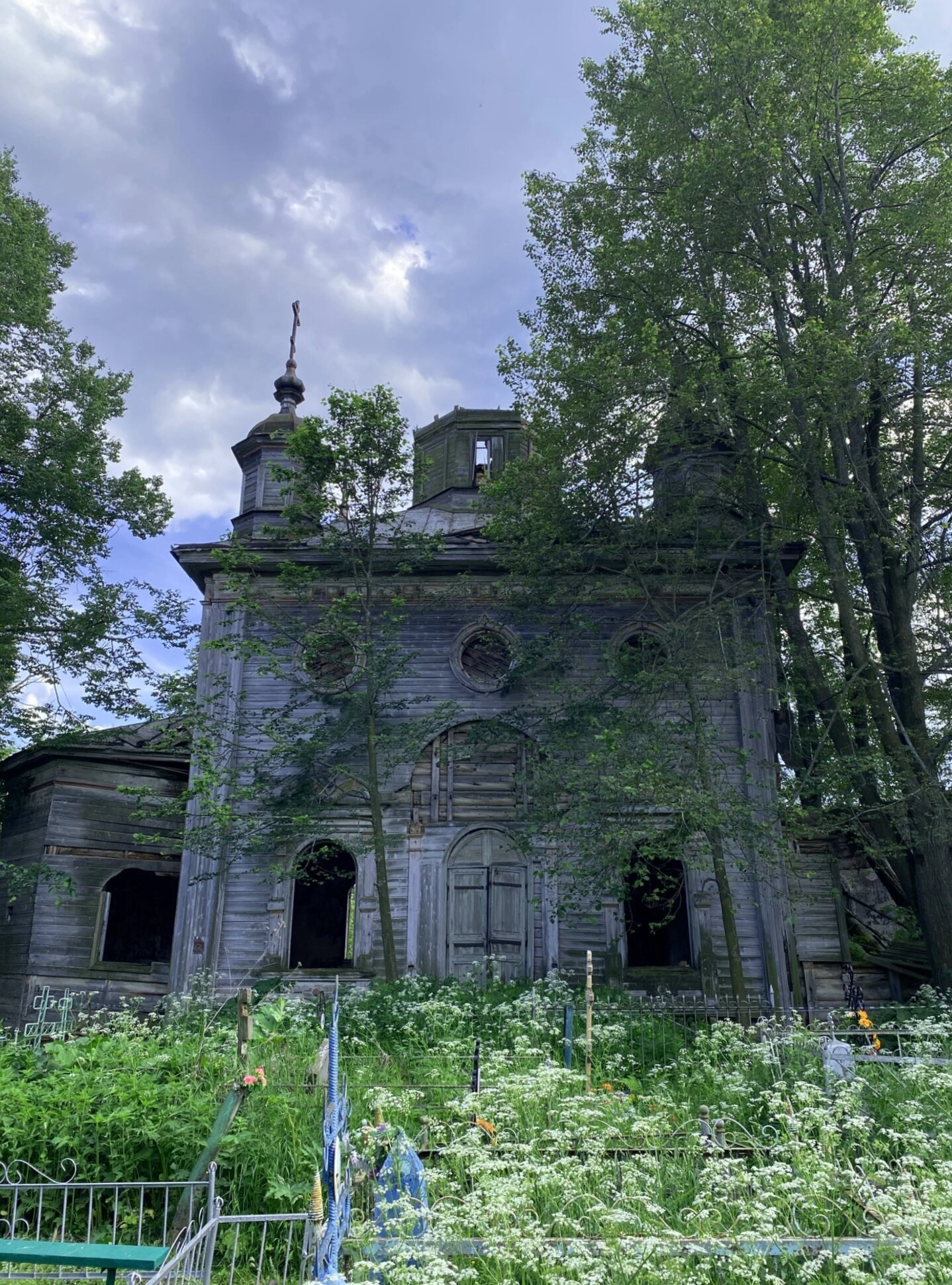 Деревянное здание церкви, стены которого потемнели от времени и воздействия природных стихий, сохранило свои основные архитектурные формы. Особого внимания заслуживает колокольня, увенчанная православным крестом, который, несмотря на заметный наклон, продолжает возвышаться над храмом. Пустые оконные и дверные проемы придают сооружению особую атмосферу утраты и величия одновременно.