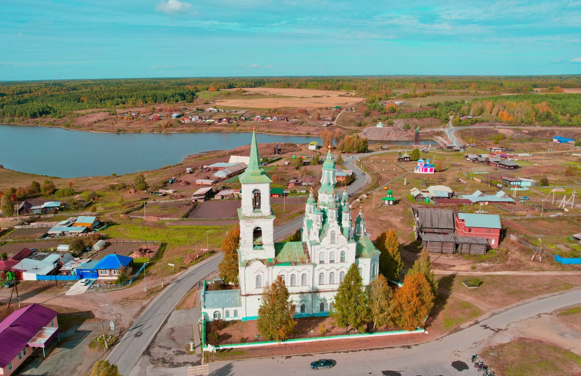 На переднем плане фотографии виден тихий водоём, отражающий благолепие церковных глав, что придаёт композиции особую духовную глубину и гармонию с природой. Окружающий музейный комплекс включает в себя подлинные сельские постройки, характерные для уральского региона, которые органично вписаны в природный ландшафт с лесными массивами на горизонте.