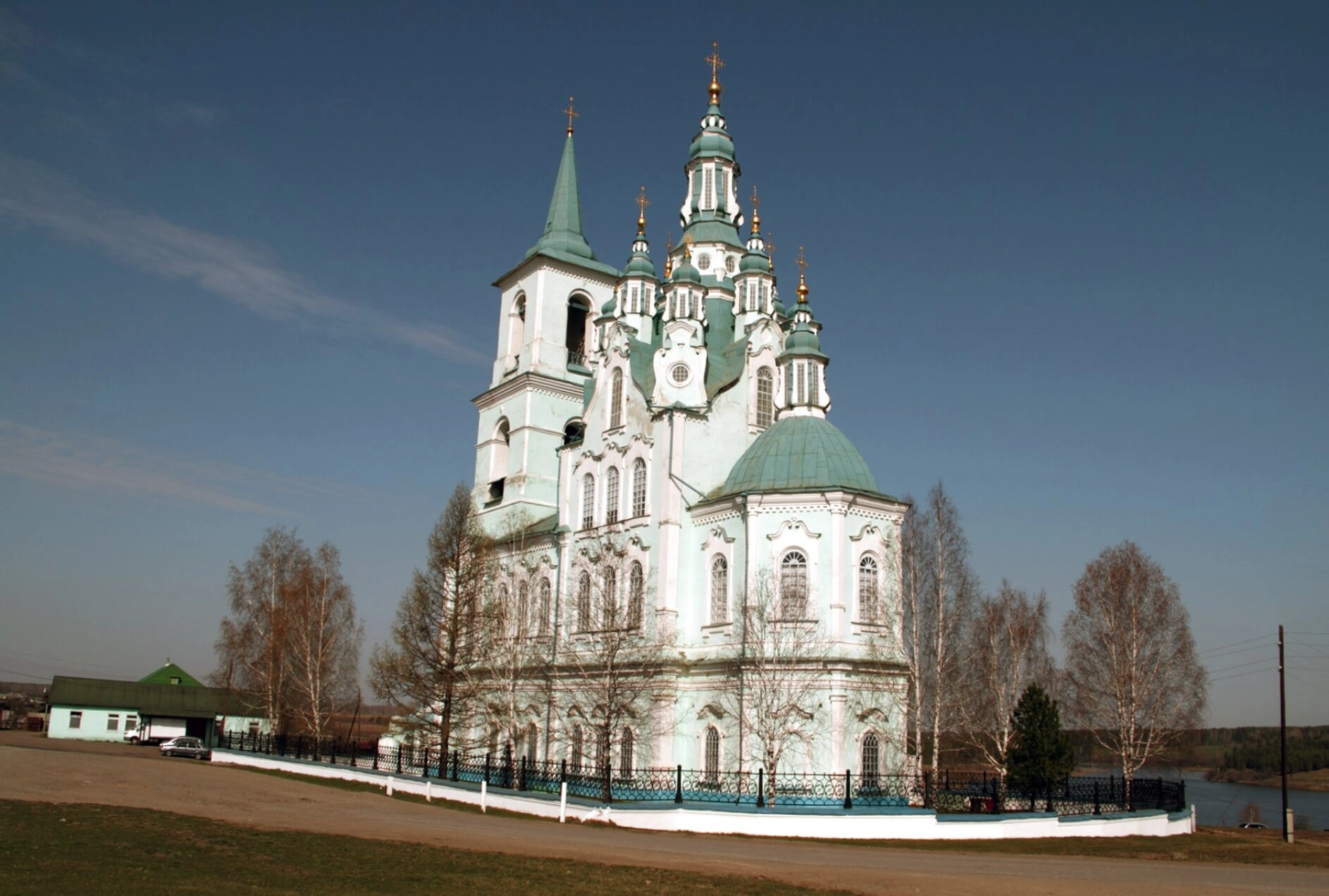 На представленной фотографии запечатлён величественный образец уральского храмового зодчества — Спасо-Преображенская церковь, расположенная в селе Нижняя Синячиха Свердловской области. Храм возвышается на живописном берегу реки Синячихи, являясь архитектурной доминантой всего музейного комплекса под открытым небом.