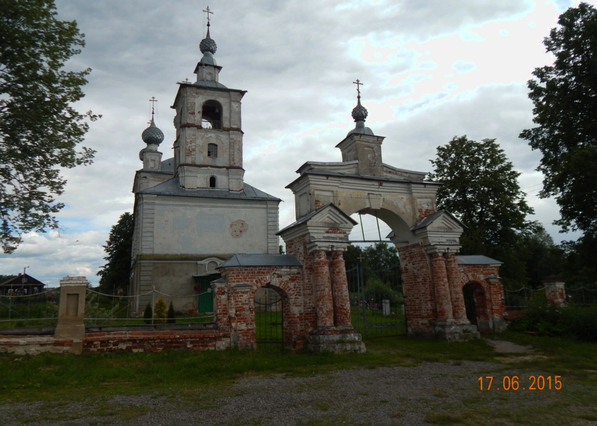 На переднем плане фотографии величественно представлена старинная кирпичная арка-ворота, служащая парадным входом на территорию погоста. За ней открывается вид на саму церковь, каменное строение, исполненное в традициях русской храмовой архитектуры. Основной объём храма увенчан массивным световым барабаном с главкой, а стройная шатровая колокольня, являющаяся неотъемлемой частью композиции, устремляется ввысь, символизируя молитвенное горение.