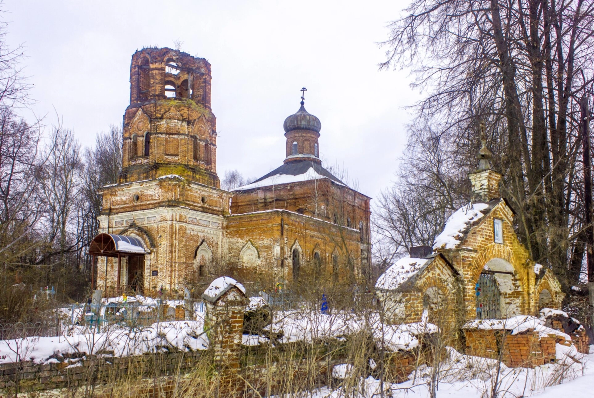 Территория вокруг храма представляет собой старинное кладбище с многочисленными надгробиями, что свидетельствует о многовековой истории этого святого места. Зимний пейзаж подчёркивает уединённость и заброшенность храма: снег покрывает землю, крыши сооружений и ветви окружающих деревьев, создавая атмосферу благоговейной тишины и скорби о утраченной святыне.