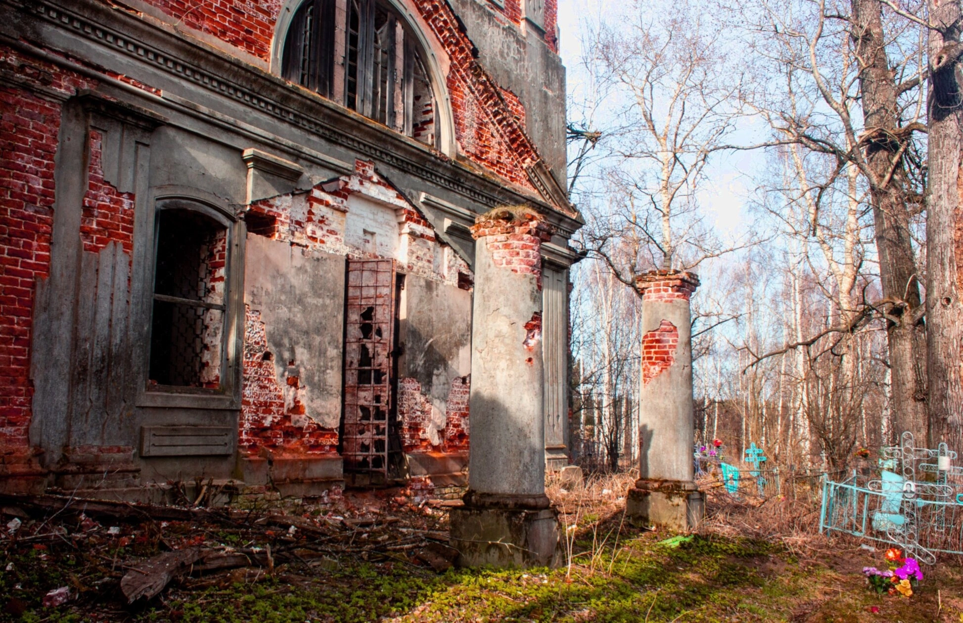 С правой стороны от церковного здания располагается старинное кладбище с сохранившимися намогильными крестами и оградами. Территория вокруг храма поросла травой, что подчёркивает заброшенность этого некогда духовного центра. На заднем плане и справа от церкви видны деревья без листвы, что позволяет предположить, что фотография сделана в межсезонье — ранней весной или поздней осенью.