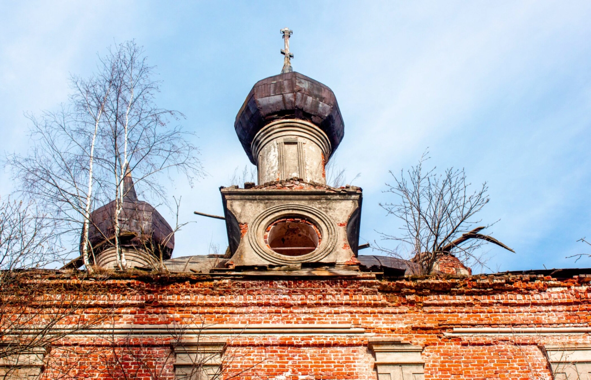 Кирпичная кладка стен храма местами сохранила первоначальную структуру, однако повсеместно видны глубокие трещины и осыпавшаяся штукатурка. В основании центрального купола просматривается круглое оконное отверстие, ныне пребывающее в запустении. Особую атмосферу скорби создают тонкие деревья без листвы, проросшие на кровле храма и вокруг куполов, что указывает на многолетнее отсутствие реставрационных работ.