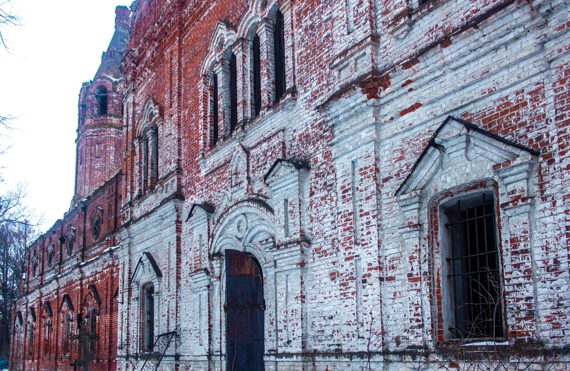Окружающий ландшафт свидетельствует о зимнем времени года: голые ветви деревьев, снежный покров у основания стен и общая атмосфера уединенности подчеркивают заброшенное состояние святыни. Тусклое естественное освещение пасмурного дня усиливает впечатление скорби о утраченной духовной обители.