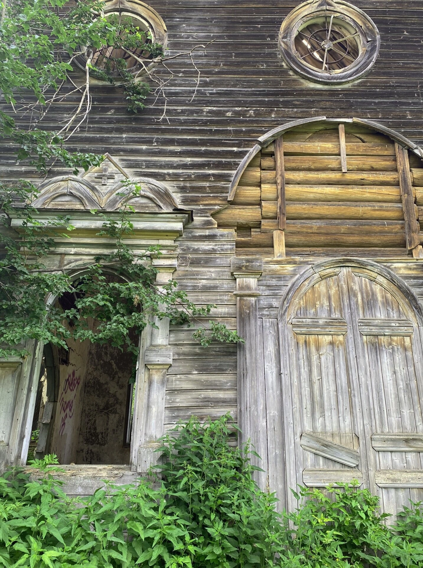 В верхней части композиции просматриваются два круглых оконных проёма, традиционных для православной храмовой архитектуры. Левое окно сохранило металлическую решётку, в то время как правое значительно повреждено - его деревянное обрамление частично утрачено. Ниже расположен арочный проём с сохранившимися декоративными резными элементами, напоминающими о былом благолепии этого домостроительства Божия.