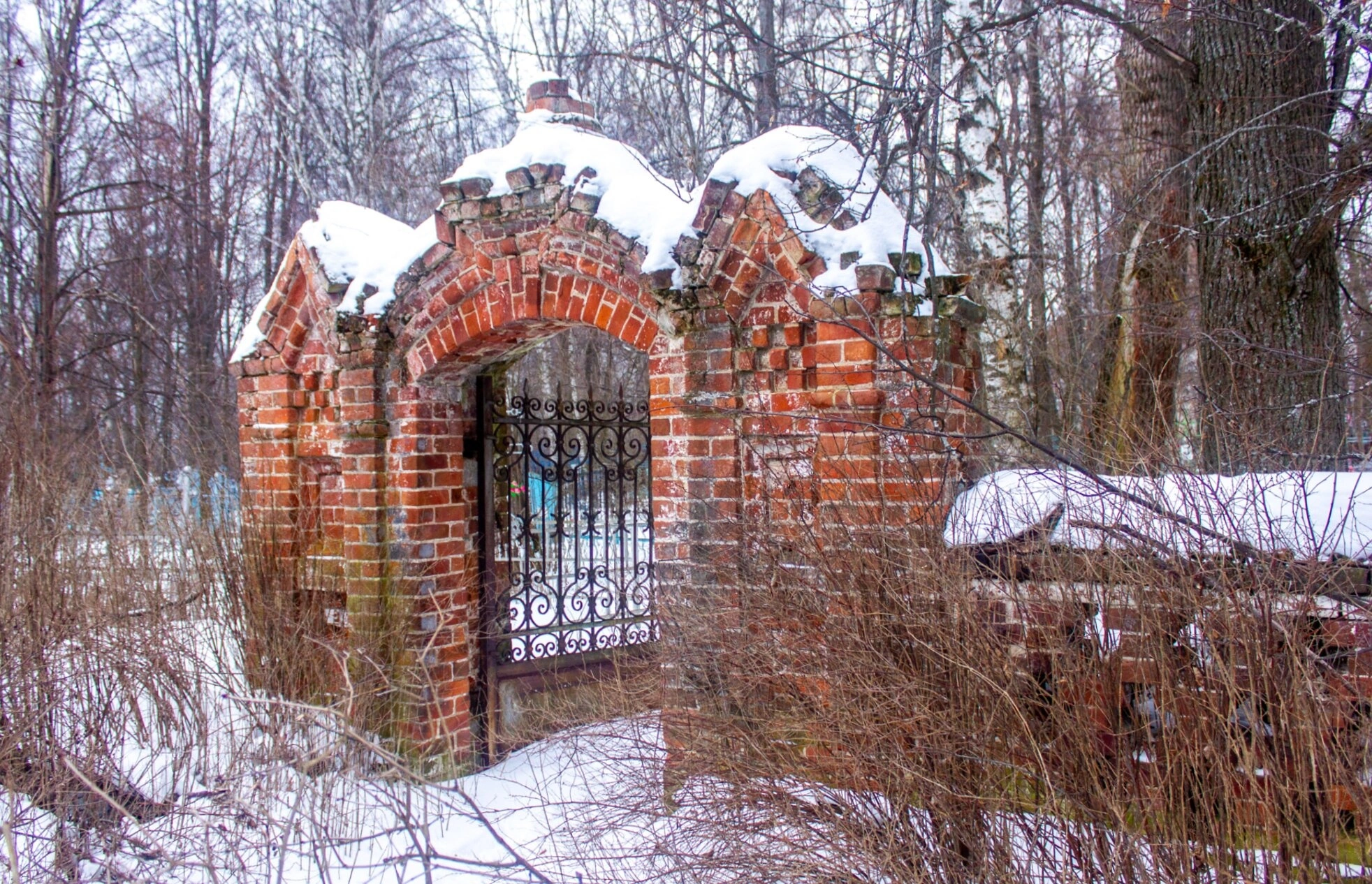 В зимний период архитектурный памятник предстаёт в особом умиротворённом виде. Кирпичная кладка арки покрыта слоем снега, создающим контраст с тёмно-красным цветом материала. Вокруг церковной постройки простирается зимний лес с голыми деревьями и кустарниками, чьи ветви также укрыты снежным покровом.