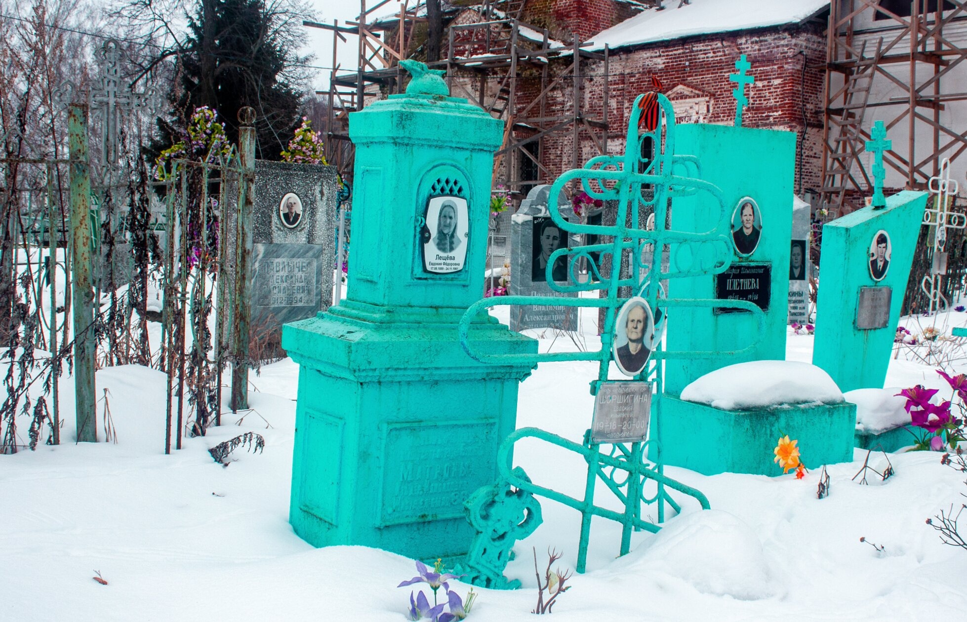 На переднем плане фотографии видны ухоженные могилы с ярко-синими надгробиями, что характерно для современных православных захоронений. На каменных памятниках различимы фотографии усопших, а металлические оградки и искусственные цветы, выступающие из-под снега, свидетельствуют о заботливом отношении живых к памяти почивших.
