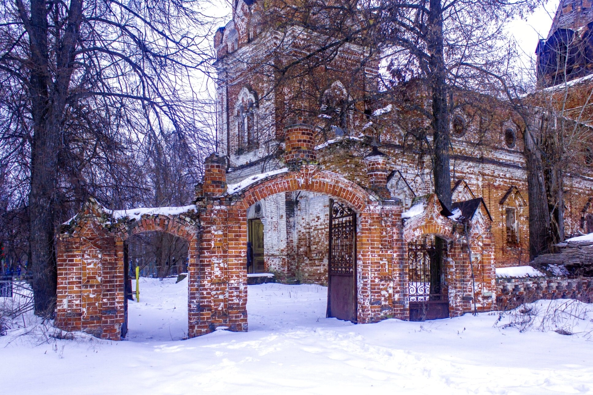 Состояние храма вызывает скорбь - значительная часть кирпичной кладки обрушилась, особенно пострадали арки и несущие стены. Деревья, окружающие церковь, стоют без листвы, что в сочетании с снежным покровом указывает на зимний период съемки. Земля вокруг храма покрыта снегом, подчеркивая заброшенность этого некогда благодатного места.
