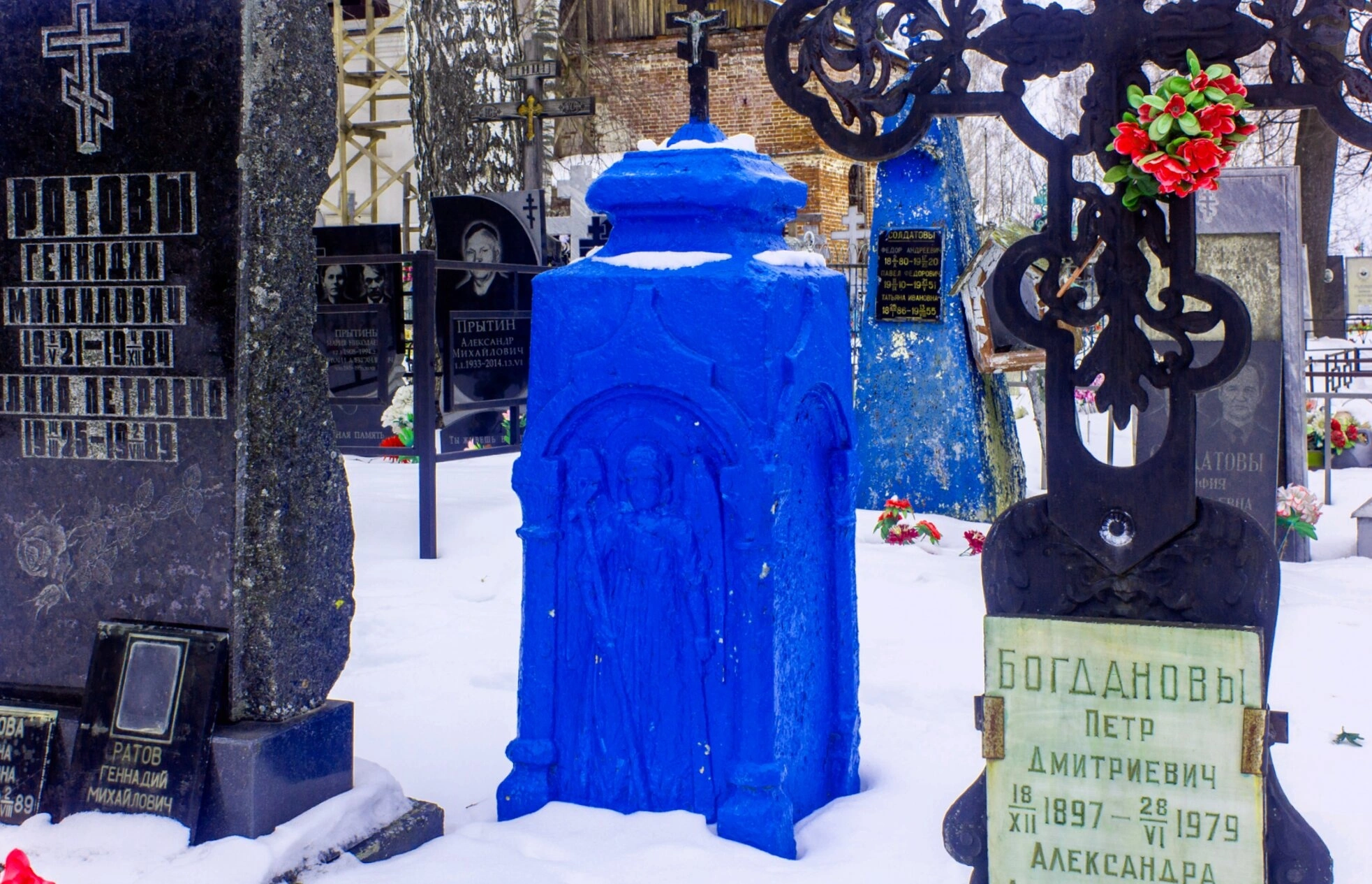 На представленной фотографии запечатлено зимнее кладбище при Спасо-Преображенской церкви в селе Сухаренки Городецкого района. Снежный покров укрывает землю и надгробия, создавая атмосферу благоговейной тишины и вечного покоя. В центре композиции возвышается ярко-синий памятник в форме кивория, украшенный рельефными изображениями святых образов, что характерно для православной погребальной традиции.