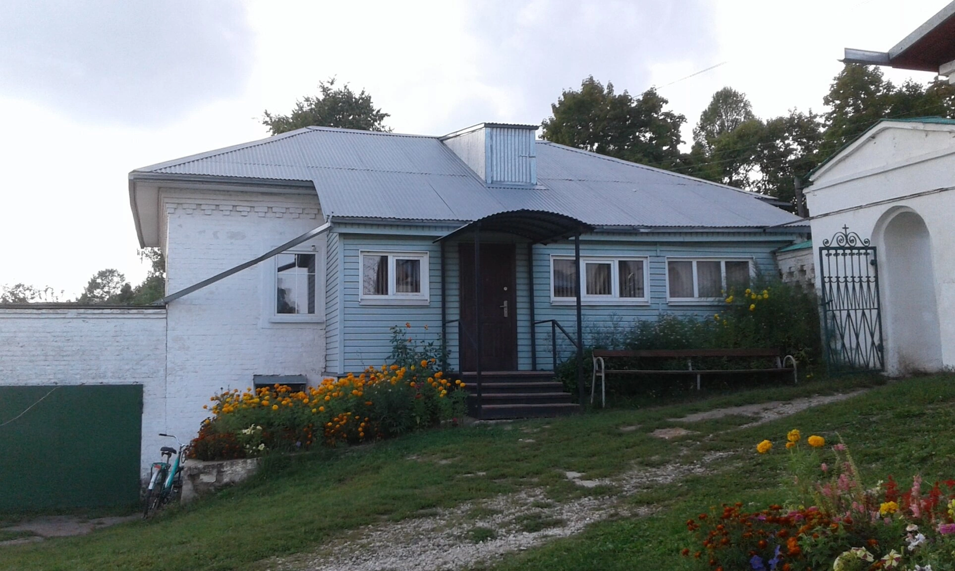 На представленной фотографии запечатлён живописный вид одного из уголков древнего города Шуи Ивановской области. На переднем плане изображён ухоженный жилой дом, вероятно, относящийся к исторической застройке города. Прилегающая территория украшена цветущими растениями, среди которых узнаются яркие бархатцы, символизирующие в православной традиции неувядающую красоту райских садов и напоминающие о заботливом отношении к божьему творению.