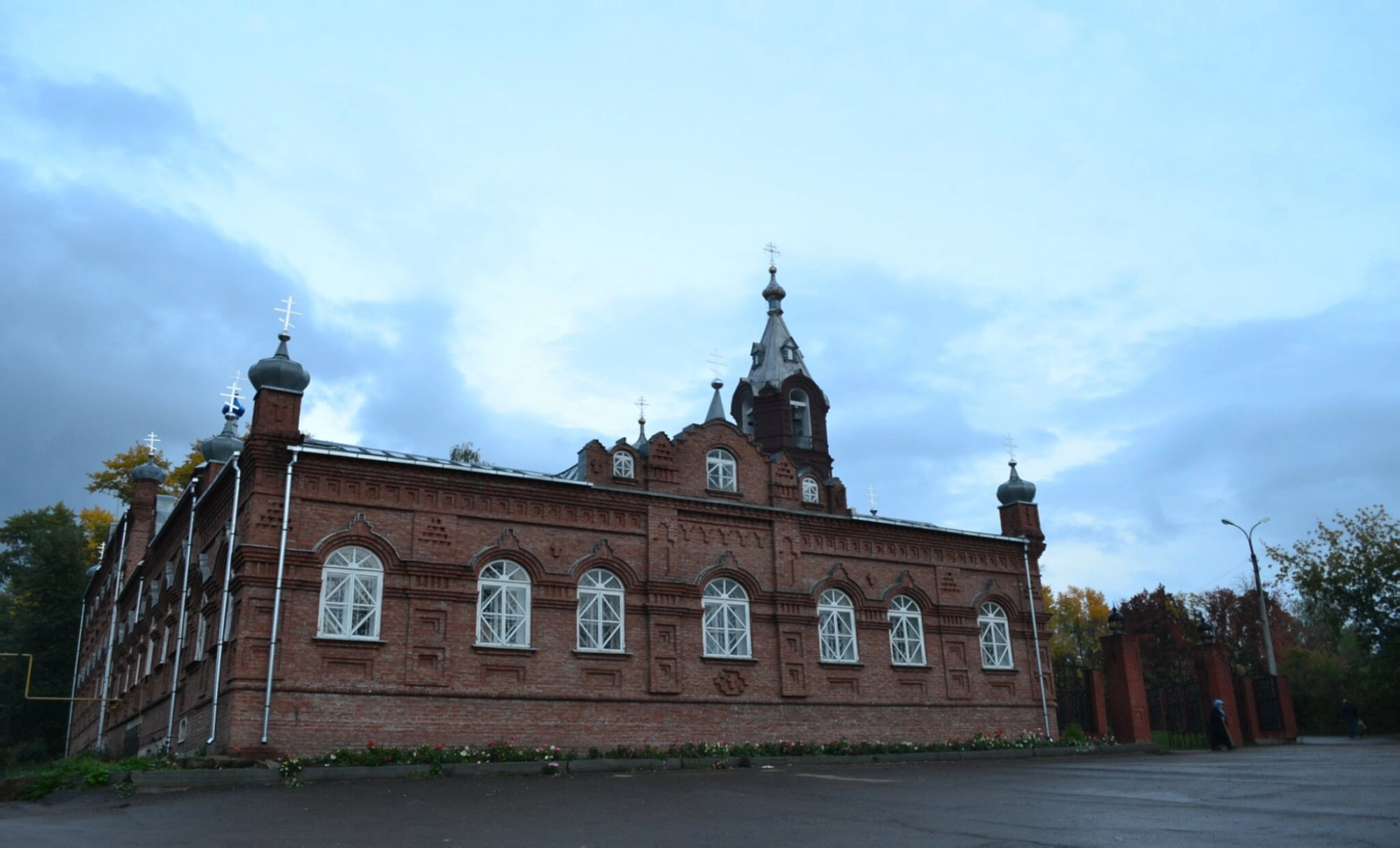 На представленной фотографии запечатлён величественный Спасо-Преображенский храм, расположенный в городе Воткинске Удмуртской Республики. Этот православный собор, возведённый из красного кирпича, является выдающимся памятником церковной архитектуры конца XIX века и духовным центром всего Воткинского благочиния.