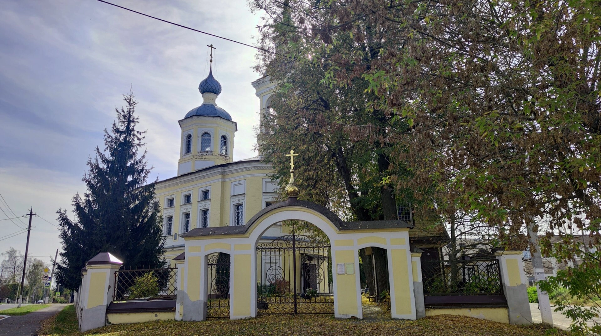 Фасад церкви украшен изящным лепным декором, пилястрами и наличниками окон, что придаёт монументальному зданию особую лёгкость и нарядность. Фотография позволяет рассмотреть ограду с двумя воротами, что является неотъемлемой частью архитектурного ансамбля. Исторические источники свидетельствуют, что в своде алтаря верхнего храма сохранилась уникальная фреска с изображением Пресвятой Троицы в иконографии «Отечество», а на стенах — композиции «Распятие» и «Положение во гроб».
