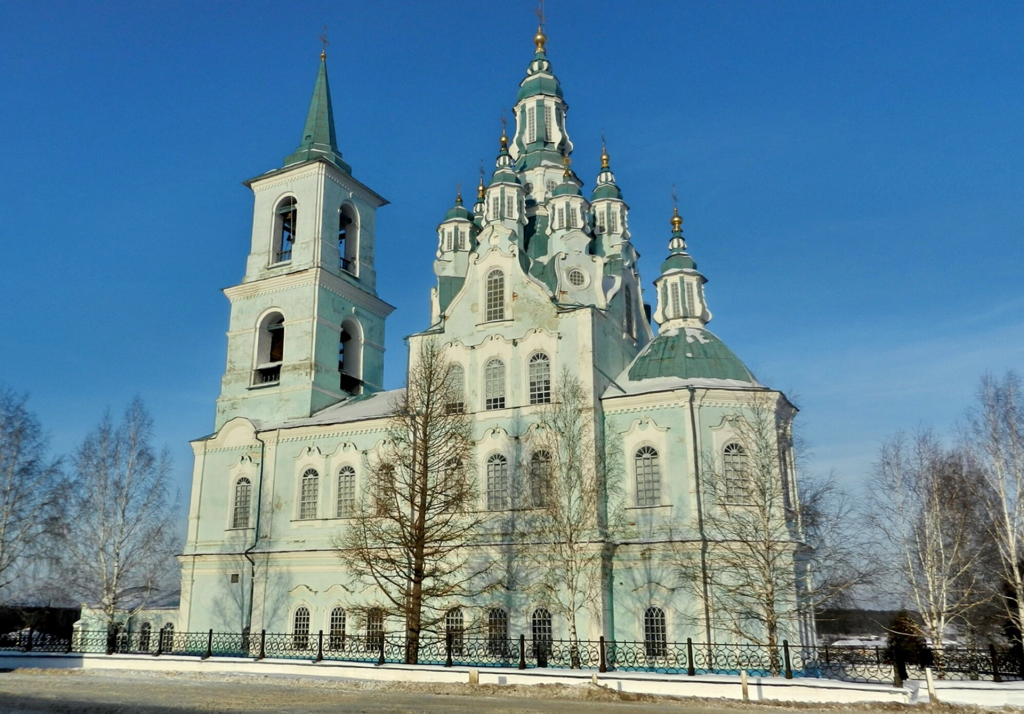 На представленной фотографии запечатлён величественный Спасо-Преображенский храм, расположенный в селе Нижняя Синячиха Свердловской области. Монументальное здание светло-голубого цвета, увенчанное десятью золочёными главами с крестами, прекрасно смотрится на фоне ясного зимнего неба. Высокая колокольня со шпилем, уходящим в лазурную высь, и грациозная апсида создают гармоничный и устремлённый вверх силуэт этого выдающегося памятника уральского церковного зодчества второй половины XVIII века.