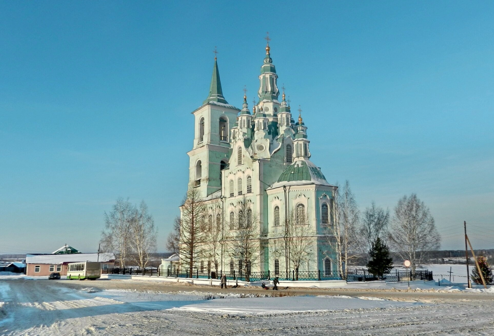 На представленной фотографии запечатлён величественный Спасо-Преображенский храм, расположенный в селе Нижняя Синячиха Свердловской области. Этот уникальный памятник церковной архитектуры конца XVIII — начала XIX века является ярким образцом уральского зодчества и стиля, традиционного для русского храмового строительства того периода.