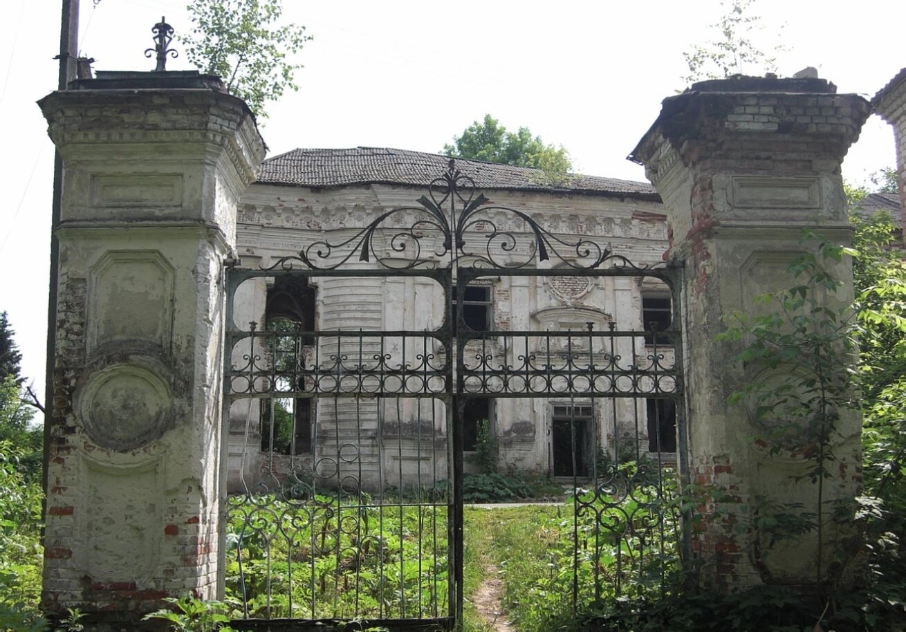 Архитектура каменного храма выдержана в традициях русского классицизма, для которого характерны строгость форм, симметрия и монументальность. На снимке отчётливо виден главный фасад здания с его утраченным ныне благолепием. Пустые глазницы оконных проёмов, частично обрушенная кровля и осыпающаяся штукатурка на стенах красноречиво свидетельствуют о долгих годах заброшенности. Перед храмом возвышаются массивные кирпичные столбы с остатками декоративных элементов, которые некогда поддерживали величественные кованые ворота, ныне также пребывающие в ветхом состоянии.