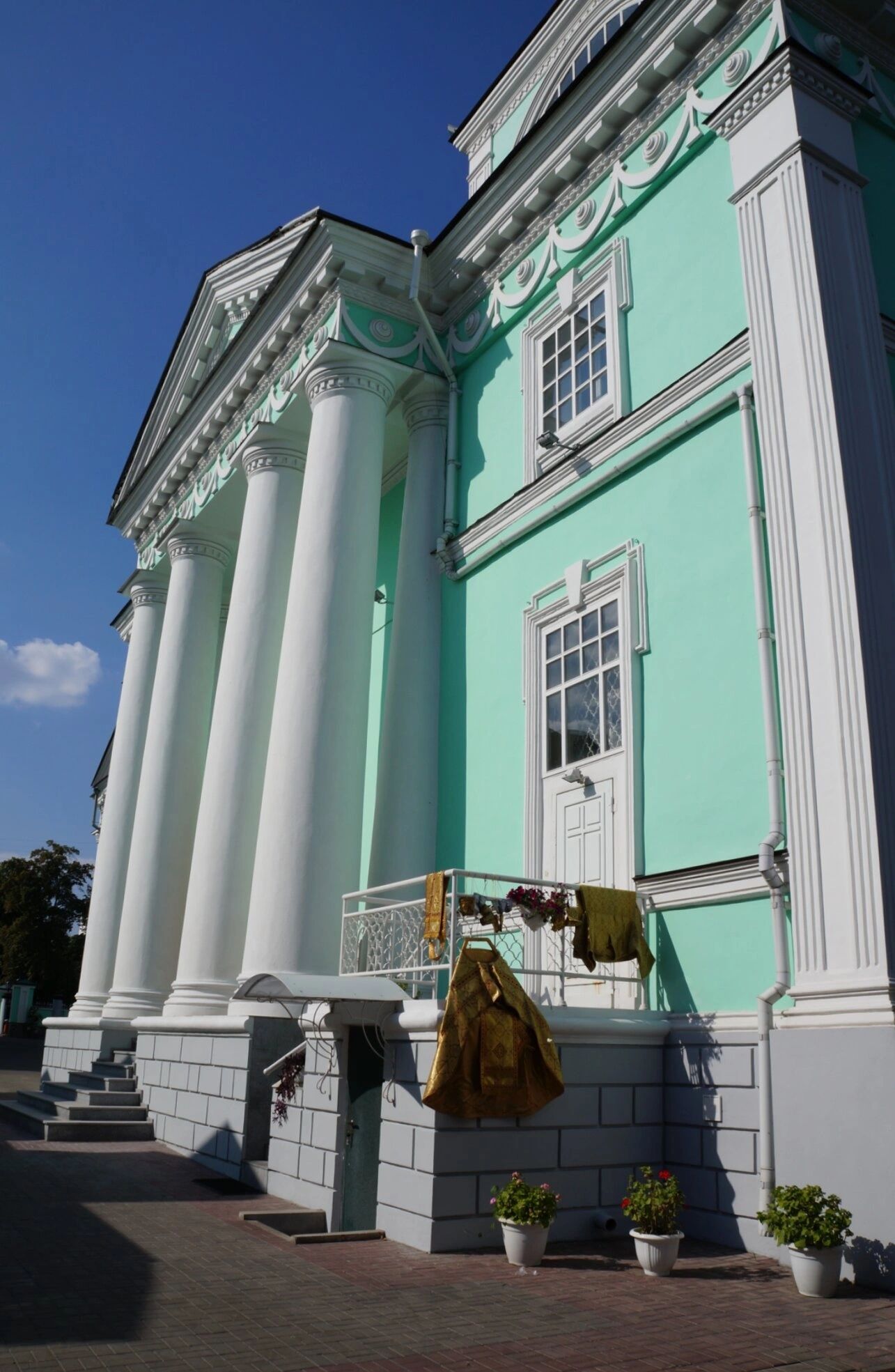 Собор, освящённый в честь Преображения Господня, возведён в стиле русский ампир и поражает гармонией своих форм. Его светло-бирюзовые стены, украшенные белоснежной лепниной, колоннами и изящными карнизами, символизируют чистоту и устремлённость к горнему миру. Высокие арочные окна наполняют внутреннее пространство храма божественным светом, а устремлённая ввысь колокольня с золочёным крестом служит духовным ориентиром для всего православного Белгорода.