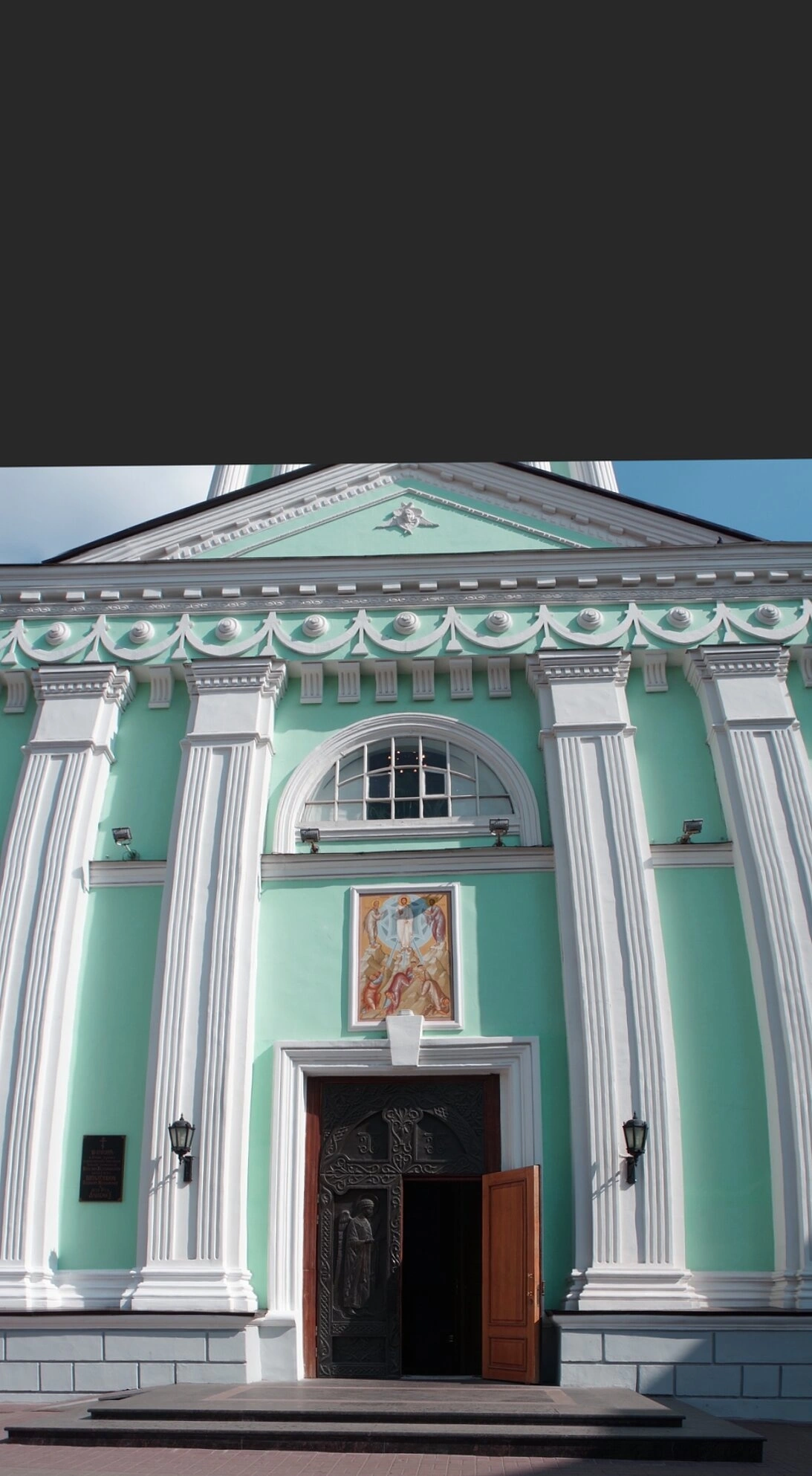 Центральный вход, представленный на снимке, оформлен в виде арочного портала с массивными резными дверями, одна из которых приоткрыта, словно приглашая верующих внутрь. Над входом расположена икона Спасителя или Преображения Господня, выполненная в ярких цветах, которая является смысловым и композиционным центром фасада. Выше прорезано полукруглое окно, наполняющее храмовое пространство естественным божественным светом.