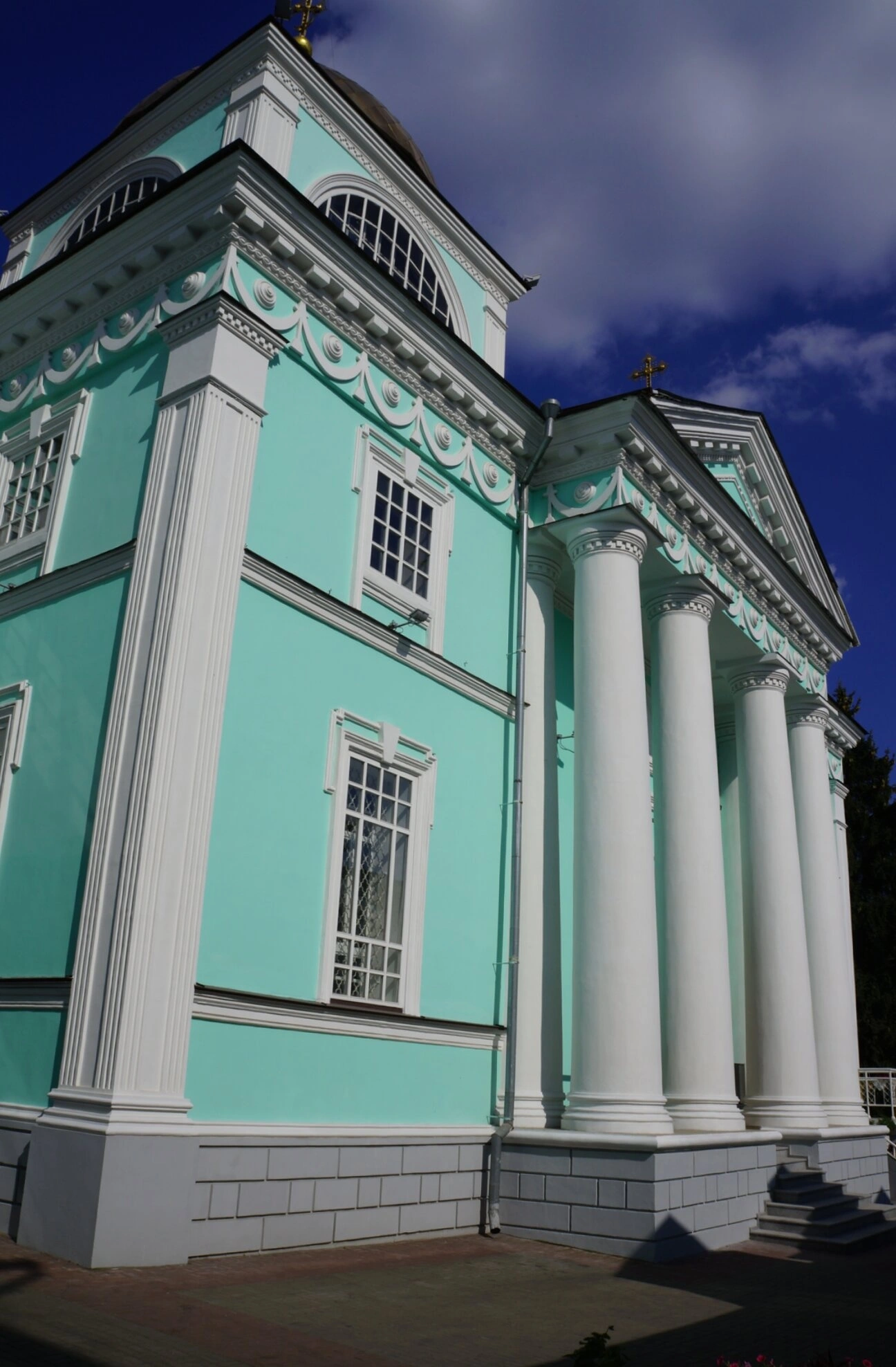 Собор представляет собой выдающийся образец русского классицизма с присущими ему чертами благородной строгости и монументальности. На снимке хорошо виден светлый, окрашенный в нежный бирюзовый цвет фасад, который эффектно контрастирует с белоснежными архитектурными элементами. Высокие колонны коринфского ордера, увенчанные выразительными капителями, поддерживают массивный портик, придающий зданию торжественный и величественный вид. Фасад украшен изящной лепниной и декоративными карнизами, что подчёркивает его праздничное убранство.