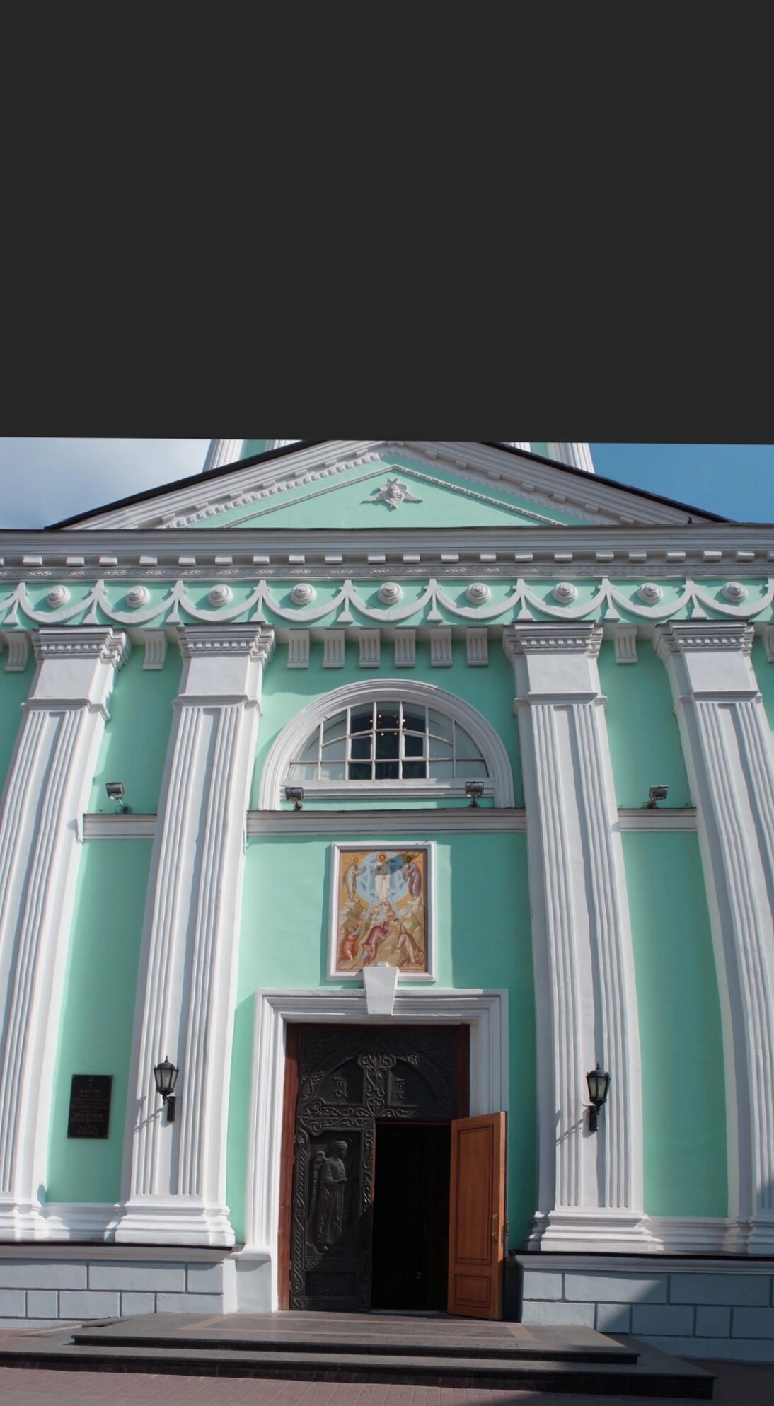 На снимке представлен главный фасад собора, выполненный в классическом стиле с элементами русской храмовой архитектуры. Центральный вход украшен монументальным арочным порталом, обрамлённым белоснежными колоннами, которые поддерживают фронтон. Над входом размещена икона Спаса Нерукотворного, благословляющая всех входящих в дом Божий. Фасад венчают пять золочёных глав, символизирующих Господа Иисуса Христа и четырёх евангелистов, которые сияют под солнцем и являются духовным ориентиром для верующих.