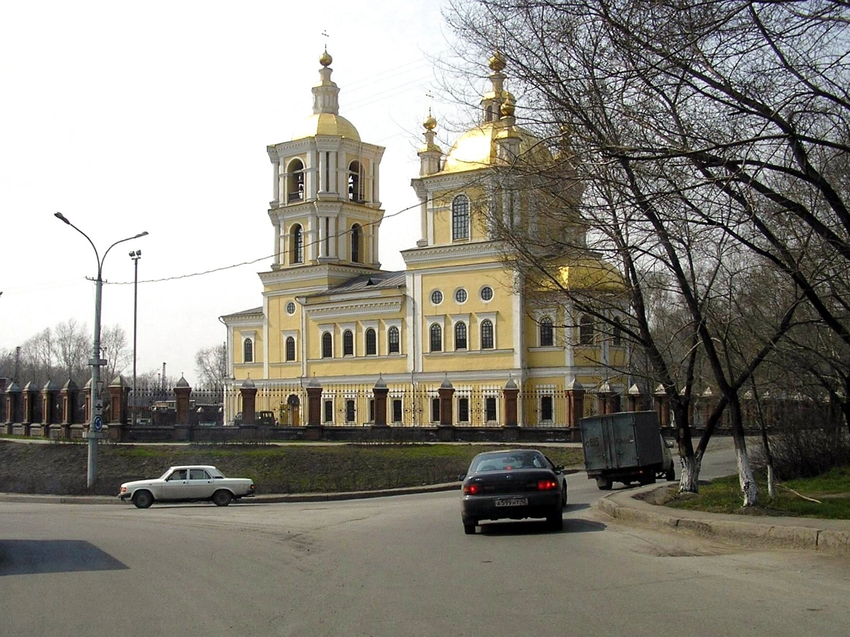 Храм расположен в исторической части города на возвышенности, что подчёркивает его доминирующее значение в городском пейзаже. По сторонам от собора виднеются ограда и оголённые деревья, что указывает на съёмку в межсезонье. Неподалёку проходит оживлённая городская магистраль, однако это не нарушает величия и спокойствия, исходящего от святой обители. Первый каменный храм на этом месте был освящён в XVIII веке, а современное здание, являющееся объектом культурного наследия, продолжает многовековые традиции православия на кузнецкой земле. Сегодня собор является не только архитектурной доминантой, но и средоточием глубокой духовной жизни, привлекая паломников и горожан своей благодатной силой и небесной красотой.