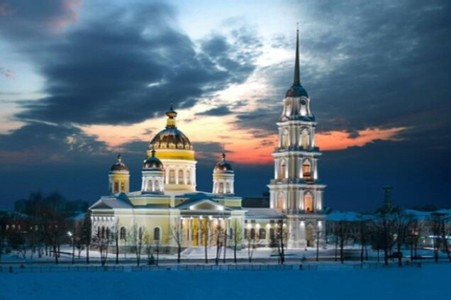 На представленной фотографии запечатлён величественный Спасо-Преображенский кафедральный собор, возвышающийся в историческом центре города Рыбинска Ярославской области. Этот православный храм, являющийся одной из главных духовных доминант Верхнего Поволжья, предстаёт во всей своей красе в умиротворяющий час зимних сумерек.