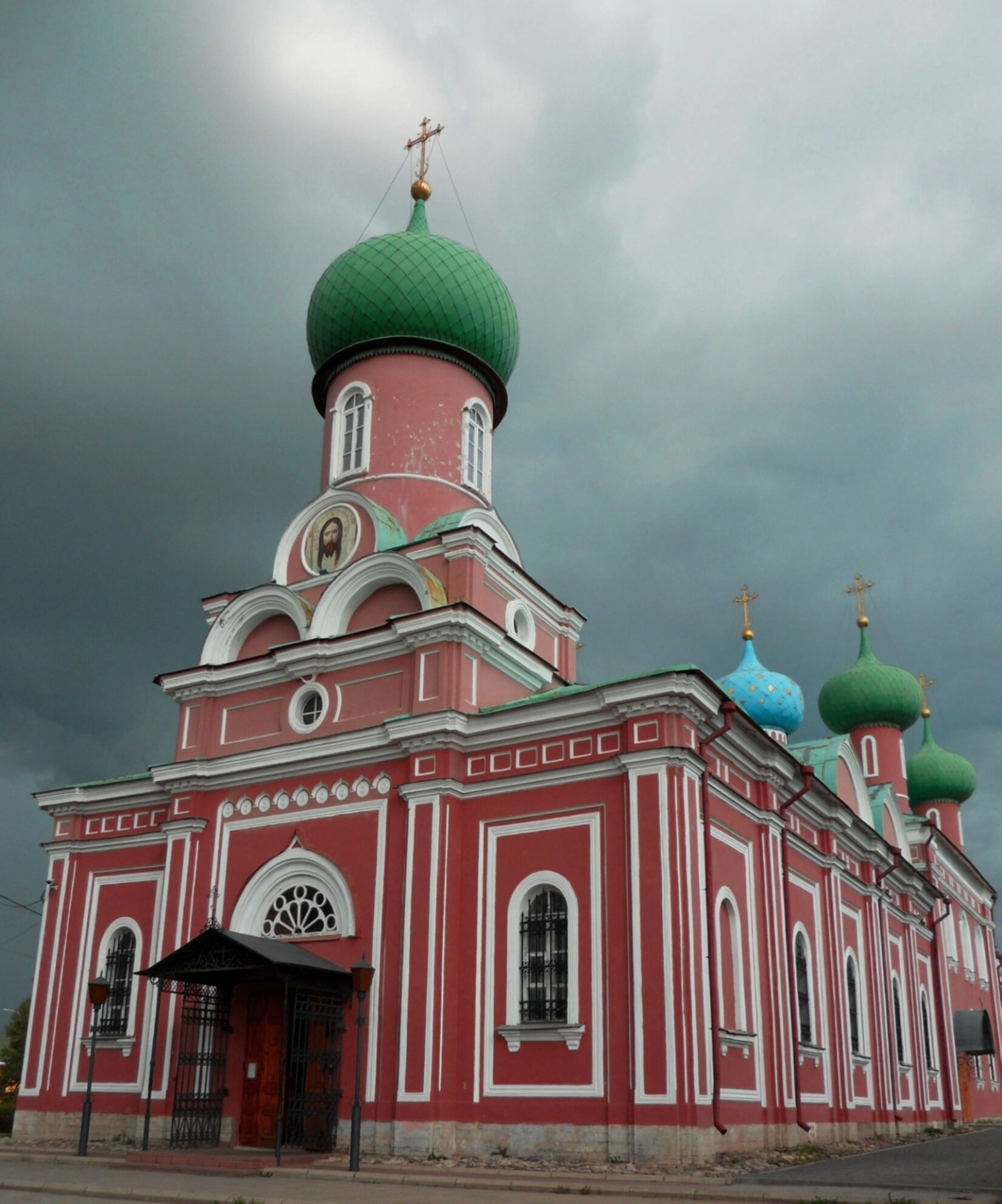 Фасад здания украшают арочные оконные проёмы с коваными решетками и наличниками. Особое внимание приковывает входная группа, состоящая из арочного портала, защищённого козырьком, и ажурных металлических ворот, демонстрирующих высокое искусство кузнецов. Фотография передаёт особое настроение: тёмное, грозовое небо на заднем плане контрастирует с ярким и светлым образом храма, что metaphorically напоминает о победе divine света над тьмой.