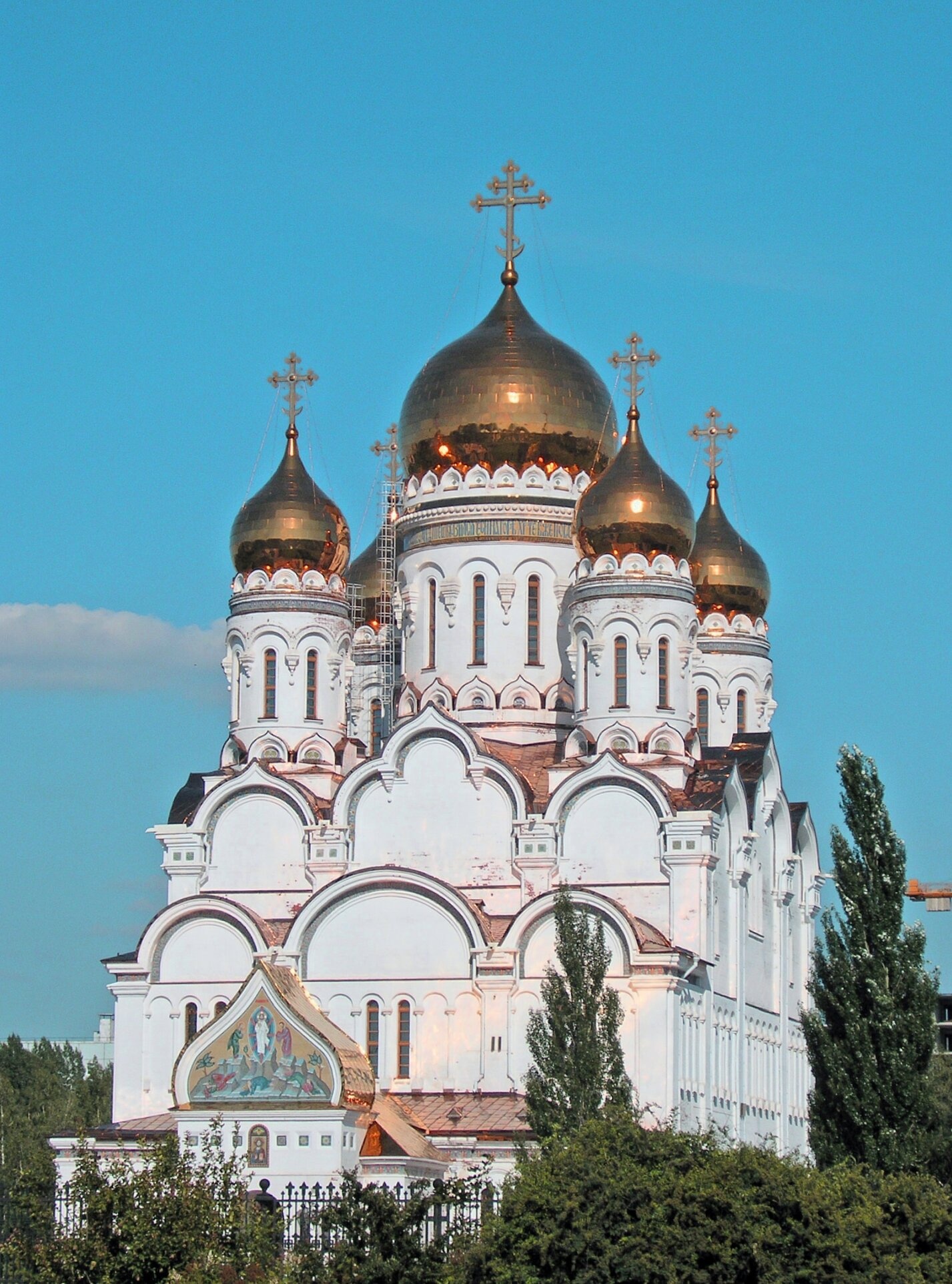 Фотография позволяет рассмотреть великолепие внешнего убранства собора: арочные оконные проёмы, изящные кокошники, чёткие линии пилястр и красиво оформленные входные порталы, приглашающие верующих внутрь для молитвы. Храмовой комплекс включает в себя отдельно стоящую колокольню, что также характерно для традиционной планировки православных монастырей и крупных соборов.
