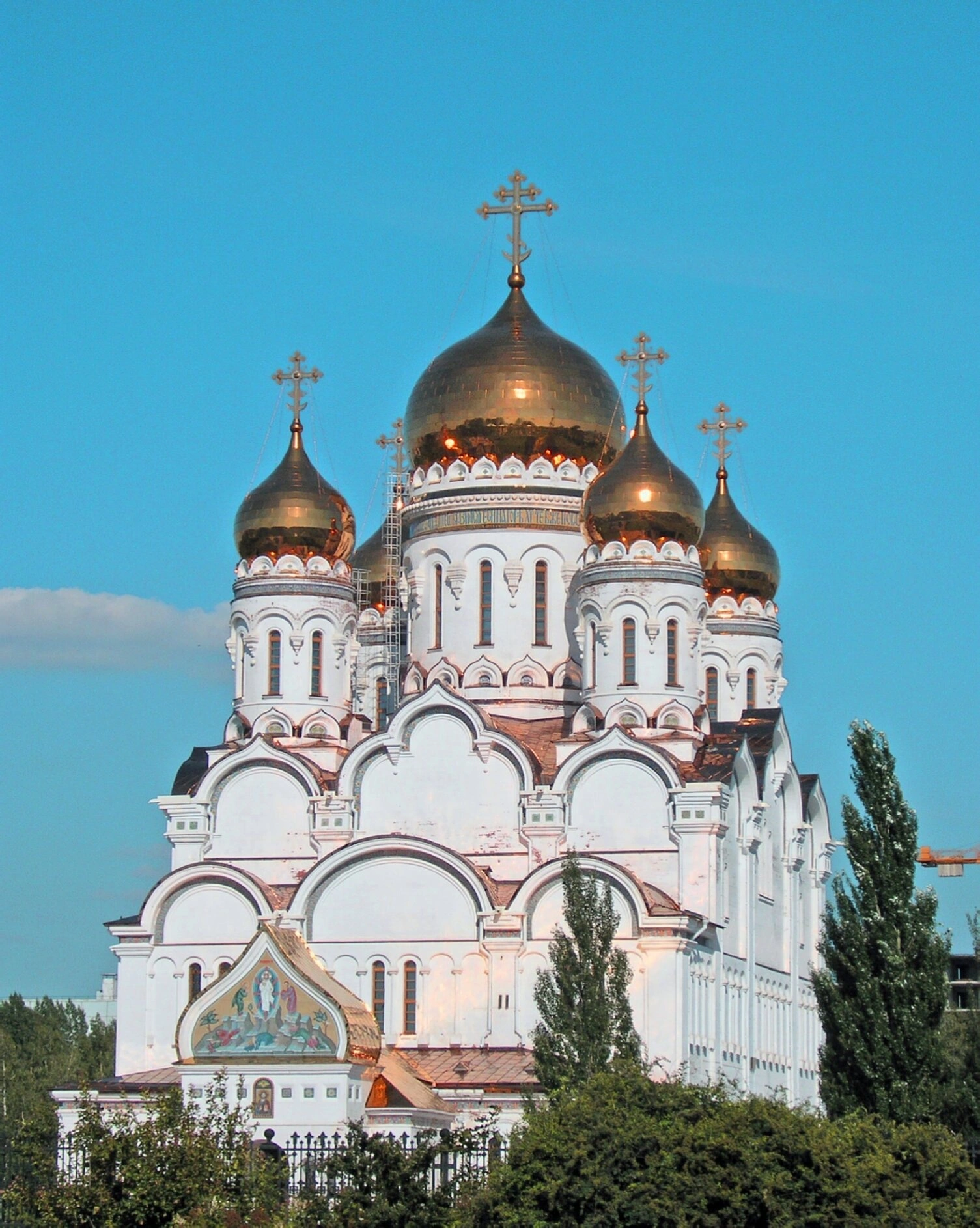 Архитектурный ансамбль собора гармоничен и устремлён ввысь. Центральный золочёный купол, символизирующий Иисуса Христа, окружён четырьмя меньшими главами, олицетворяющими четырёх евангелистов. Над главным входом расположена колокольня, чей звон созывает верующих на молитву. Фотография передаёт торжественность и благодать, исходящую от этого святого места: ярко-белые стены сияют под лучами солнца, а лазурное небо подчёркивает величие всего архитектурного комплекса.