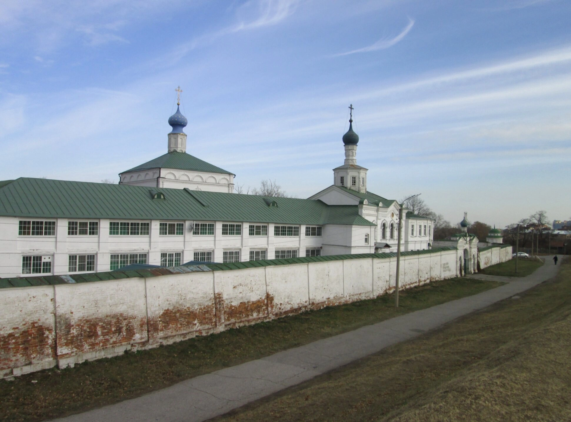 Архитектурный комплекс монастыря, формировавшийся на протяжении XVII-XIX веков, гармонично вписан в ландшафт кремлёвского холма. На снимке можно видеть монастырские постройки, выполненные в стиле классицизма, а также фрагменты крепостной стены, что подчёркивает древность и особый статус этого святого места. Монастырь был закрыт в годы богоборческих гонений, но ныне возвращён Русской Православной Церкви, и в его стенах вновь возносятся молитвы.