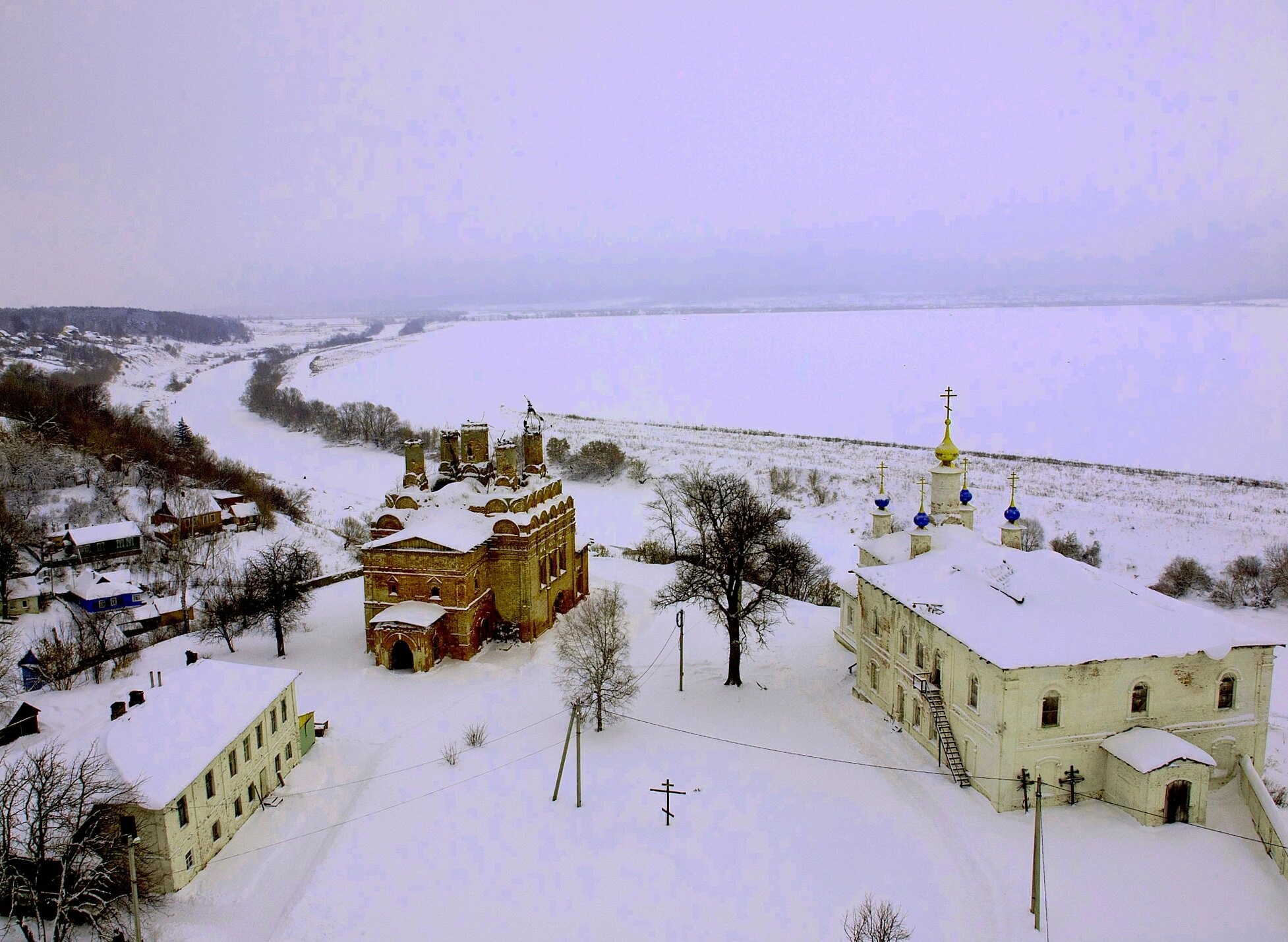 На заднем плане открывается вид на заснеженную долину реки Оки и противоположный берег. Этот великолепный вид, исторически сложившийся при подъезде к городу, и поныне определяет панораму древнего Белёва. Монастырский ансамбль, который неоднократно посещал государь Иоанн IV Грозный, внося пожертвования для его благоукрашения, и в советское время претерпевший годы запустения, ныне возрождается и является одной из ключевых святынь Белёвской епархии.