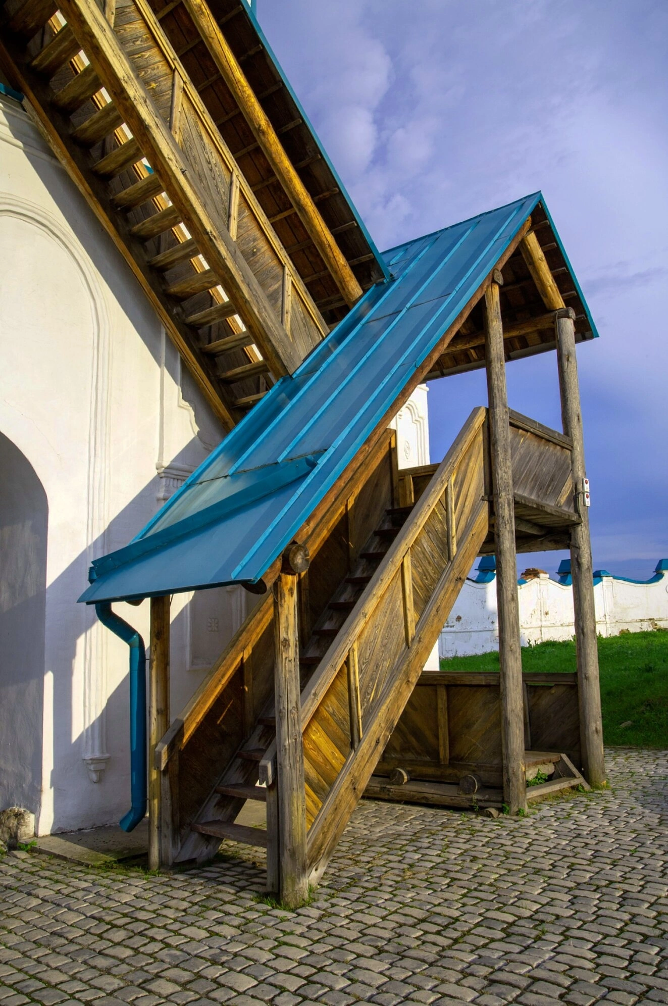 На представленной фотографии запечатлён фрагмент архитектурного ансамбля Спасо-Преображенского мужского монастыря, расположенного в старинном сибирском городе Енисейске. Центральным элементом кадра является деревянная лестница, ведущая к входу в один из монастырских храмов. Лестница накрыта защитной кровлей, выкрашенной в синий цвет, что создаёт яркий акцент на фоне беленых стен здания. Подъём символично устремлён ввысь, напоминая о духовном восхождении верующих.