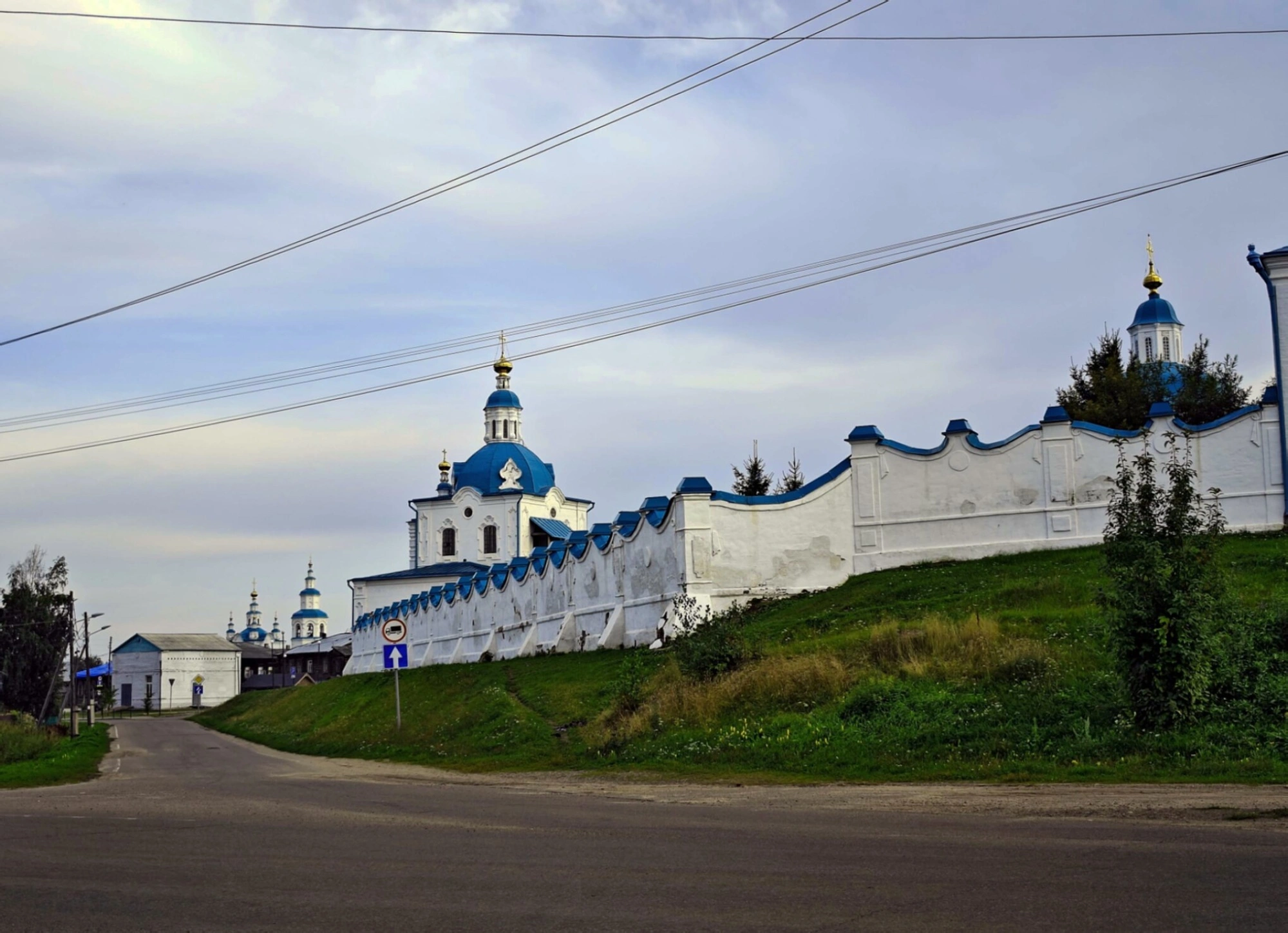 Снимок позволяет увидеть монастырскую стену, выполненную в традиционном стиле русской монастырской архитектуры. Белоснежные стены с характерными зубчатыми завершениями символизируют духовную крепость и неприкосновенность обители. Над стеной величественно возносятся к небу синие, увенчанные златоглавыми крестами купола монастырских храмов, что создаёт образ Небесного Иерусалима на сибирской земле.