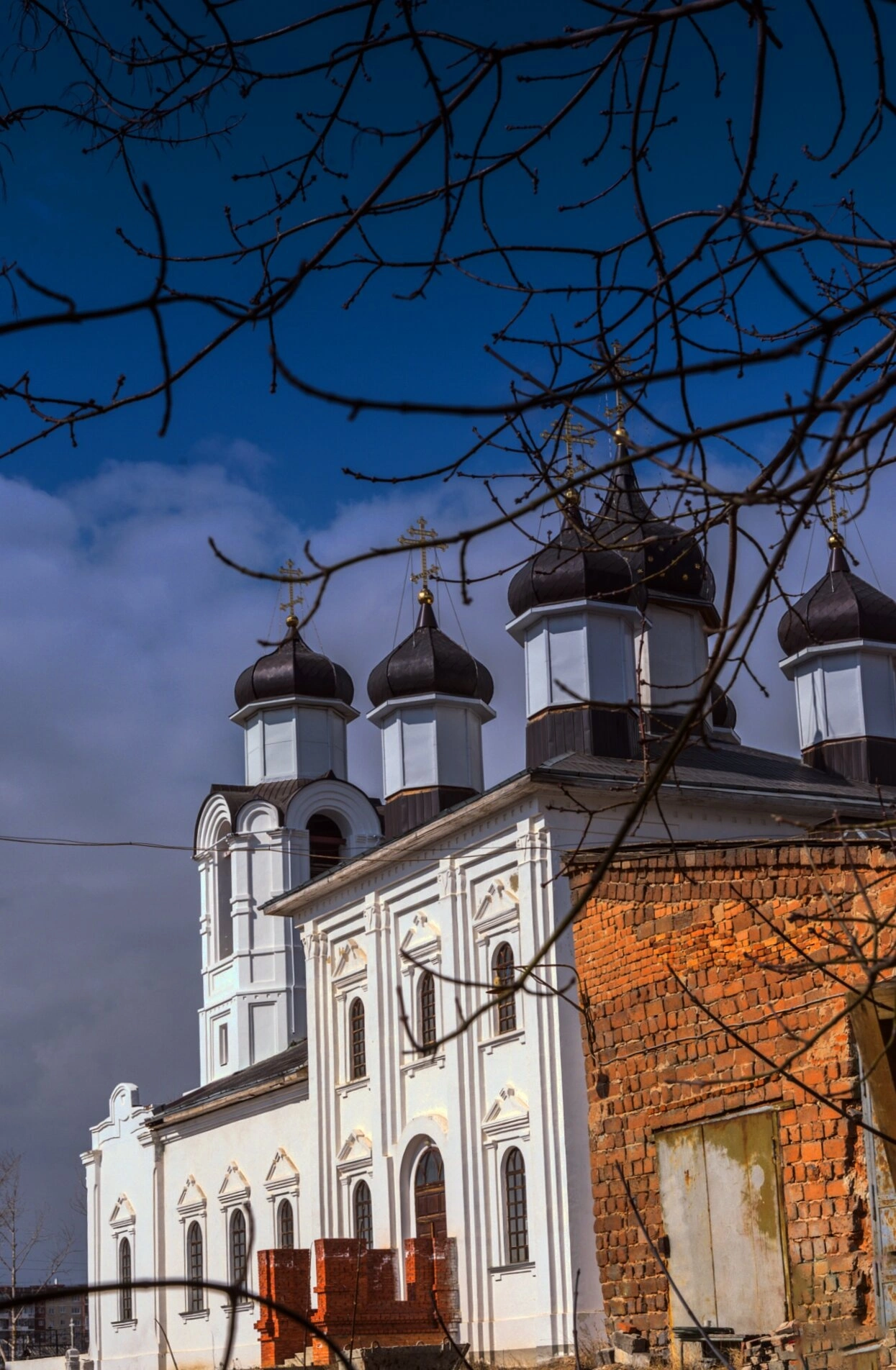 Архитектурный ансамбль монастыря являет собой образец русского церковного зодчества. На снимке хорошо виден белоснежный основной объём храма, увенчанный тёмными куполами, на которых гордо возвышаются православные кресты, символизирующие победу жизни над смертью. Многочисленные арочные оконные проёмы наполняют внутреннее пространство собора божественным светом. С правой стороны фотографии просматривается часть стены из красного кирпича, что свидетельствует о разных этапах строительства и реставрации святой обители.