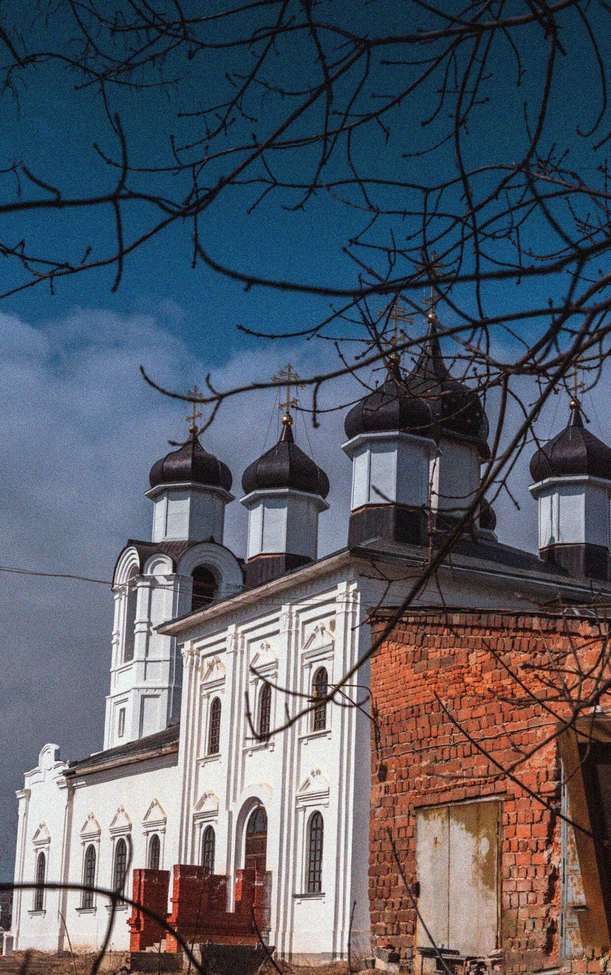 Центральным объектом снимка является белоснежный храм, увенчанный чёрными главами с сияющими золотыми крестами, устремлёнными в небо. Его архитектура воплощает традиции русского церковного зодчества. Арочные окна, декоративные элементы на фасаде и сочетание белого камня с красным кирпичом соседних построек создают гармоничный и величественный образ святой обители.