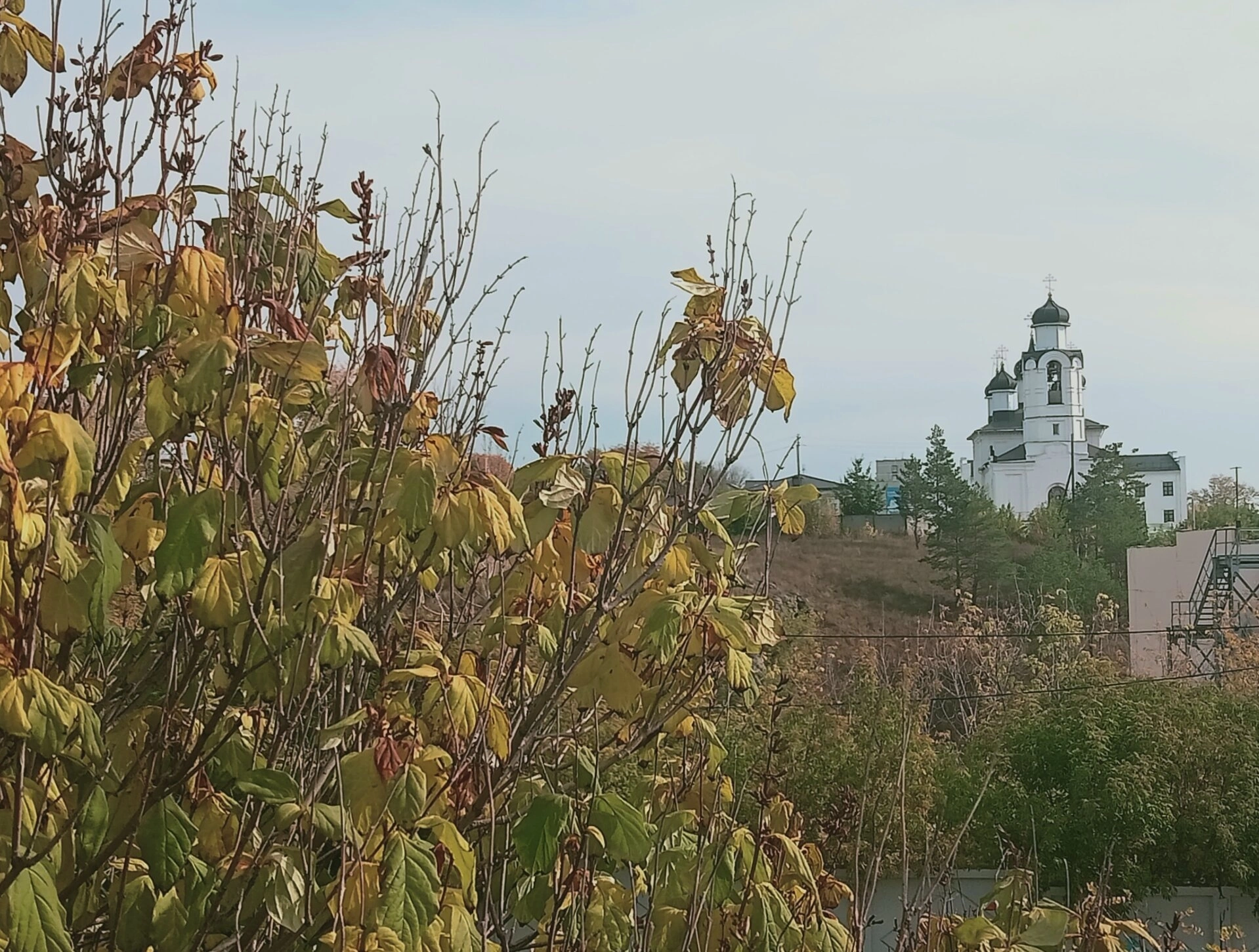 На заднем плане просматриваются элементы городской застройки Каменска-Уральского, что напоминает о близости мирской жизни к духовной обители. Небо, затянутое облаками, создаёт мягкое освещение, придающее снимку особую атмосферу благоговения и спокойствия.