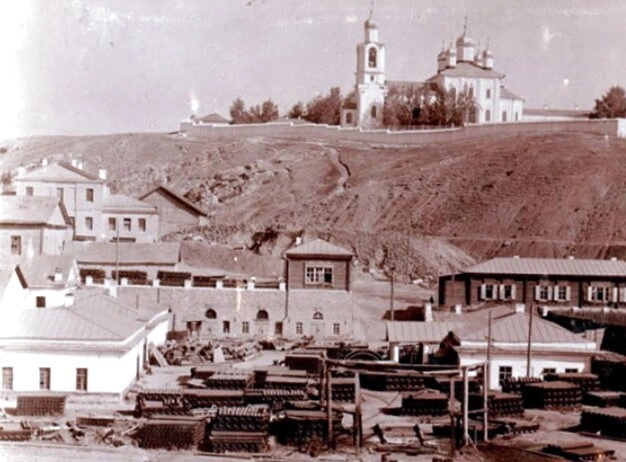 На исторической фотографии запечатлен Спасо-Преображенский монастырь в городе Каменск-Уральский Свердловской области, расположенный на высоком левом берегу реки Каменка. Монастырский комплекс, возвышающийся на холме, представляет собой значительный архитектурный ансамбль, доминирующий в окружающем пейзаже. На снимке хорошо просматриваются основные сооружения обители, включая главный храм в честь Преображения Господня с его характерным пятиглавием и ярусной колокольней.