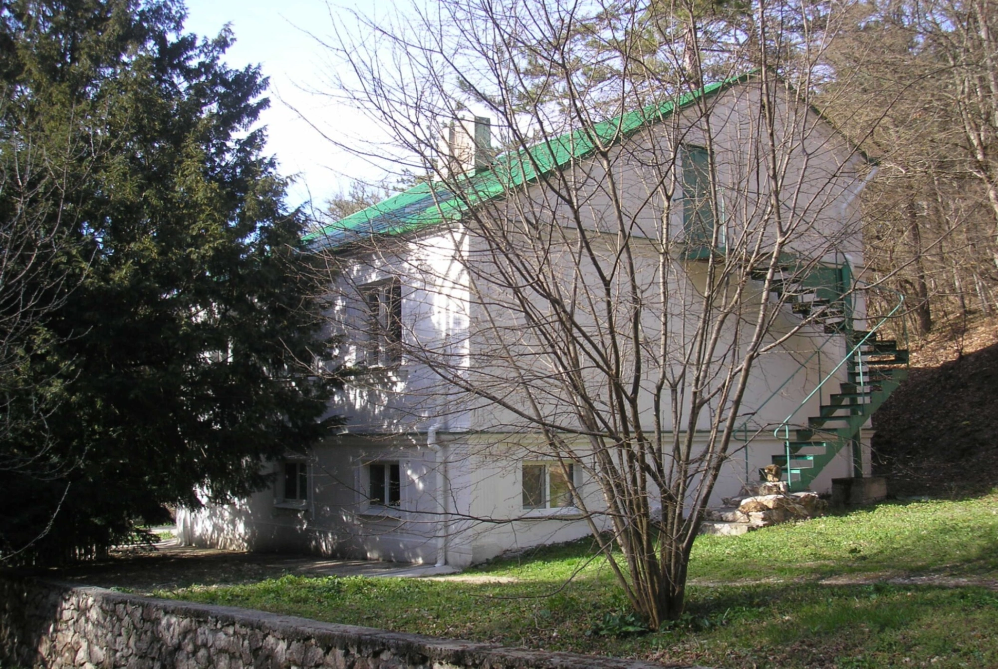 На переднем плане фотографии видно двухэтажное здание с белыми оштукатуренными стенами и скатной крышей, покрытой зеленым материалом. Справа по фасаду расположена внешняя металлическая лестница, ведущая на второй этаж. Архитектурный облик строения, окруженного хвойными и лиственными деревьями, гармонично вписан в природный ландшафт, напоминающий Русский Север. Яркий солнечный свет, падающий на фасад, подчеркивает чистоту линий и создает глубокие, четкие тени, добавляя кадру духовной торжественности.