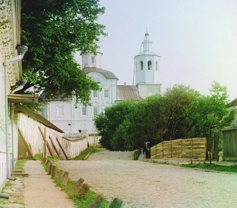 На переднем плане фотографии видна грунтовая дорога, ведущая к святым вратам монастыря. Окружающий пейзаж с деревянными оградами и зеленью создаёт ощущение умиротворения и покоя, отстранённости от суетного мира. Слева от собора заметен фрагмент одного из монастырских зданий с резными декоративными элементами и водосточной трубой, что добавляет снимку исторического контекста.