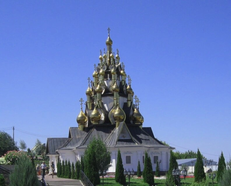 Территория вокруг собора благоустроена и ухожена сестрами монастыря. Зелёные насаждения, хвойные деревья и аккуратные кустарники обрамляют святыню, подчёркивая её красоту и гармонию с природой. Фотография передаёт атмосферу благодатного спокойствия, мира и умиротворения, свойственную этому намоленному месту. Каждый элемент снимка свидетельствует о величии православной веры и красоте духовной жизни, процветающей в стенах древней обители.