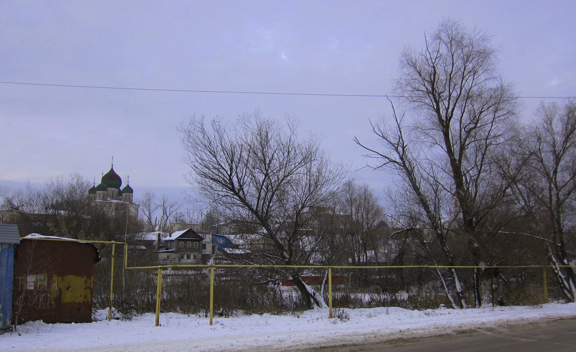 На переднем плане фотографии видна заснеженная дорога и элементы городского благоустройства, включая ограждение. Оголенные ветви деревьев свидетельствуют о глубоком зимнем времени, когда природа пребывает в состоянии покоя и ожидания грядущего обновления. Окружающая храм застройка представлена скромными жилыми домами, что подчеркивает доминирующее положение собора в городском ландшафте.