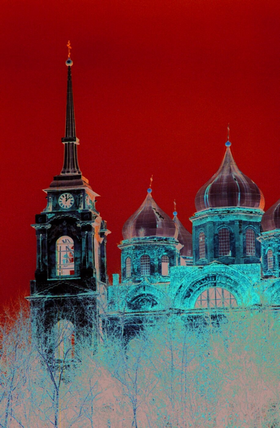 Над голыми ветвями возносится к небу монументальное здание собора, выстроенное из красного кирпича с изящными декоративными элементами и белокаменным цоколем. Его архитектурный облик, характерный для русского церковного зодчества второй половины XIX века, символизирует духовную твердыню и православную веру. Храм увенчан несколькими луковичными главами, покрытыми серым металлом и увенчанными золочёными крестами, сияющими в лучах солнца.