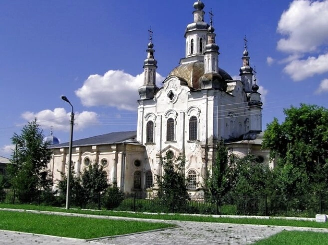На фотографии запечатлён величественный Спасо-Преображенский собор, являющийся главным православным храмом города Шадринска Курганской области. Это выдающийся памятник церковной архитектуры второй половины XVIII века, который dominates the historical part of the city.