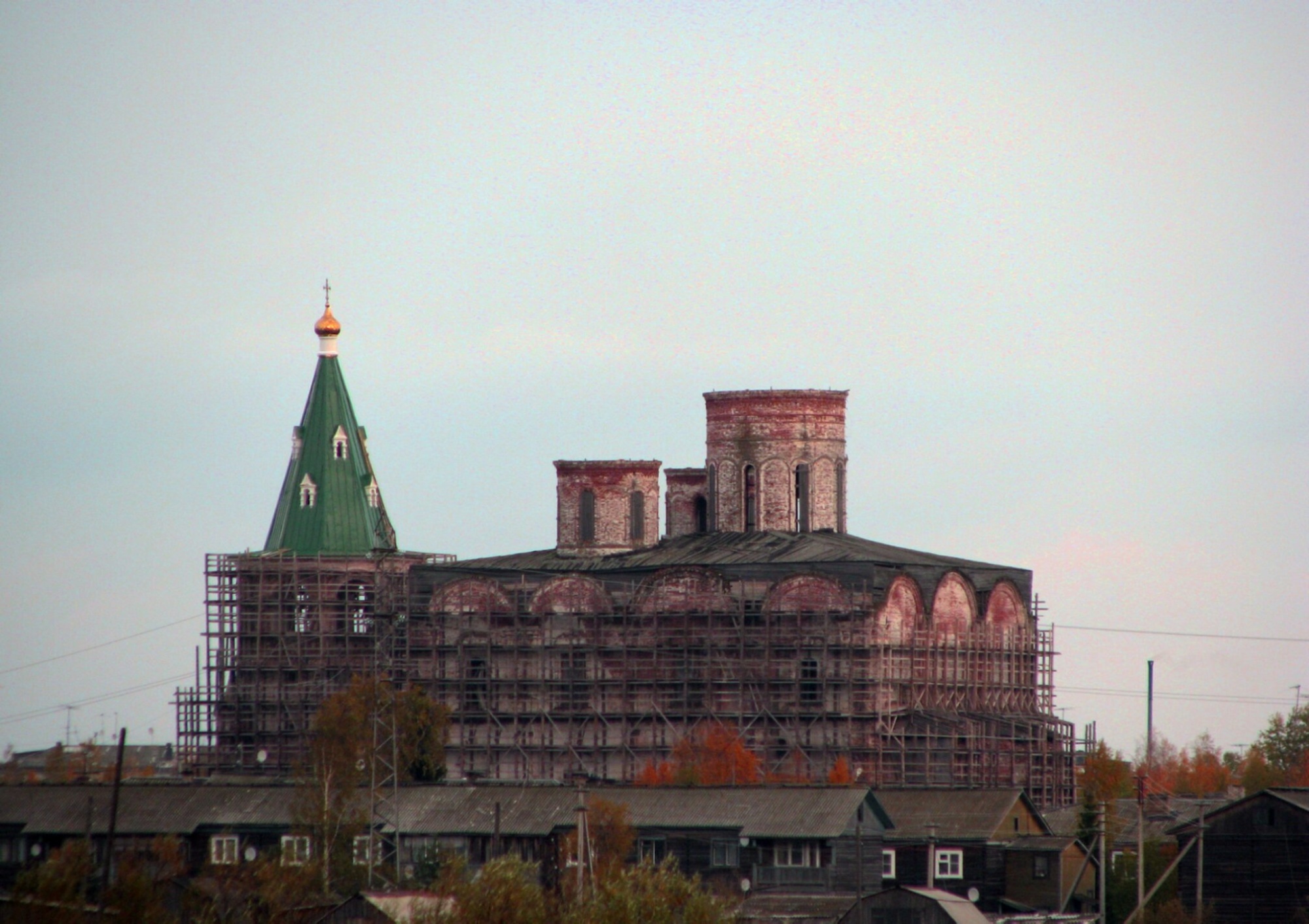 На момент съёмки здание находилось в состоянии реставрации, о чём свидетельствуют установленные строительные леса. Частично утрачены купола, однако конструкция стен и основных объёмов сохранилась. Местоположение собора точно соответствует историческим координатам в Холмогорах - 64.23144000 северной широты и 41.73975000 восточной долготы.