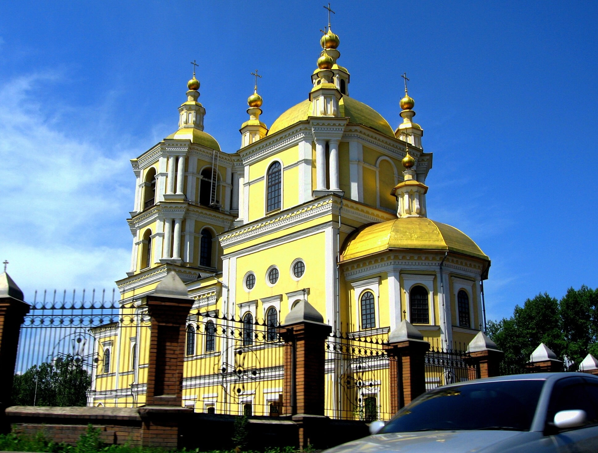На представленной фотографии запечатлён величественный Спасо-Преображенский собор, являющийся одной из главных православных святынь города Новокузнецка. Храм располагается по историческому адресу на улице Водопадной и является старейшим каменным сооружением в Кузбассе, чьё строительство было завершено в 1835 году.