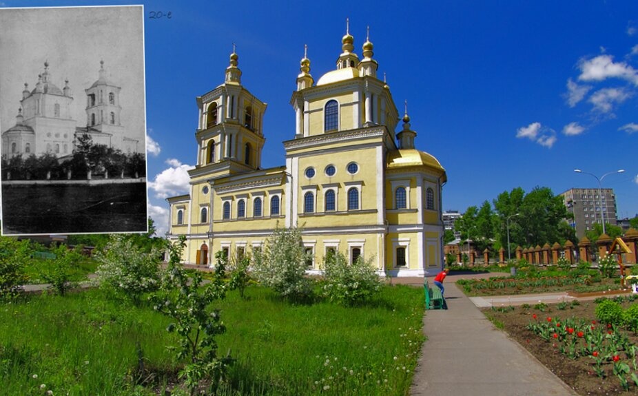На переднем плане фотографии видно, что собор окружён благоустроенной и ухоженной территорией. К его входу ведёт аккуратная дорожка, вдоль которой разбит цветник с алыми тюльпанами. Молодые деревья с нежными белыми соцветими и зелёный газон дополняют картину, создавая атмосферу умиротворения и благолепия. На заднем плане читается современный городской пейзаж, что подчёркивает глубокую историческую преемственность и неразрывную связь святого места с жизнью города.