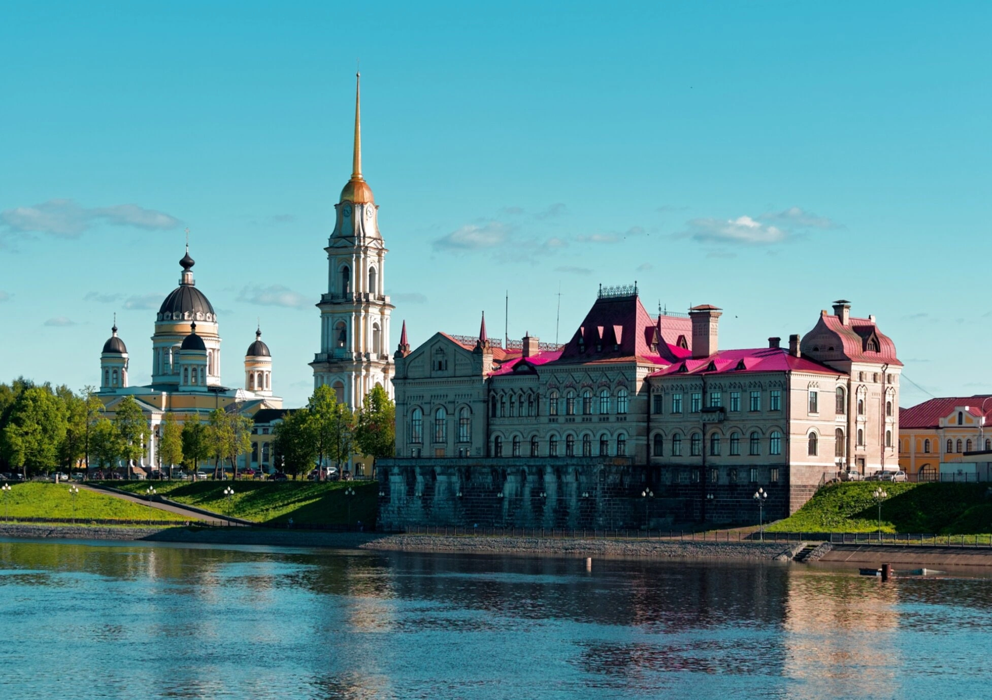 На представленной фотографии запечатлён величественный вид исторического центра города Рыбинска Ярославской области. Доминантой архитектурного ансамбля является Спасо-Преображенский кафедральный собор, один из крупнейших храмов России, построенный в середине XIX века по проекту архитекторов А.И. Мельникова и ректора Академии художеств А.И. Резанова. Его монументальный пятиглавый силуэт и устремлённая в небо стройная колокольня с сияющим золотым шпилем создают неповторимый образ, господствующий над городской застройкой и водными просторами.